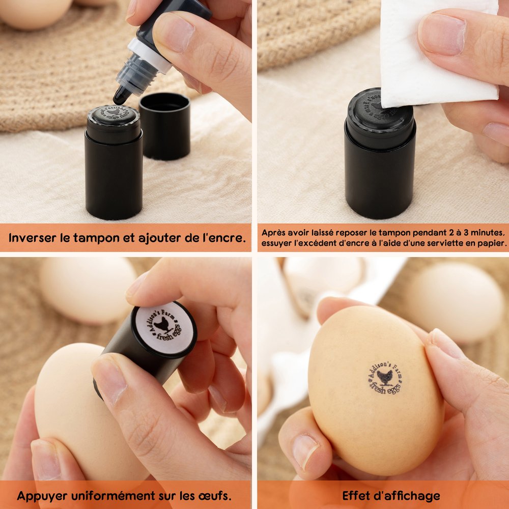 Ce tampon unique représente une silhouette de poule qui s'harmonisera avec n'importe quel œuf ou carton. Vous pouvez ajouter un texte, tel qu'un nom de famille ou un message spécial, pour faire de chaque œuf un souvenir unique qui non seulement rehausse la présentation de l'œuf, mais reflète également votre fierté en tant qu'agriculteur ou éleveur.