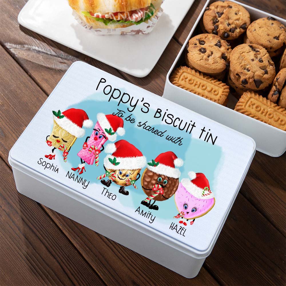 Cette boîte à biscuits est ornée de 1 à 8 biscuits de Noël et d'un chapeau de Père Noël, ce qui fait très Noël. Vous pouvez choisir l'image des biscuits et les assortir selon vos préférences pour en faire une image qui vous représente ou qui représente votre famille, et la personnaliser avec le nom et le texte de votre choix pour rendre cette boîte à biscuits plus intime et chaleureuse.