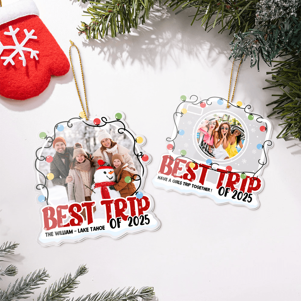 Avec son cadre circulaire et ses détails d'appareil photo vintage, cet ornement est centré sur votre photo de famille ou d'ami préférée. Personnalisé avec "MEILLEUR VOYAGE DE [Année]" et un texte personnel, il est entouré de lumières de Noël et de flocons de neige scintillants - une capsule temporelle suspendue de souvenirs de voyage et de charme de vacances.