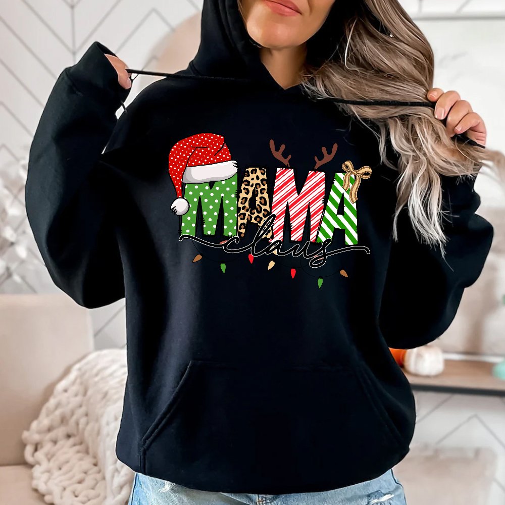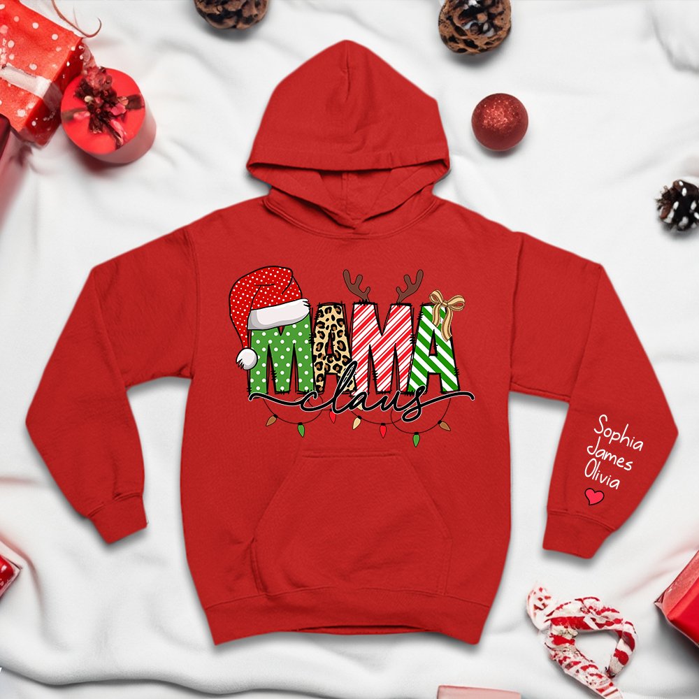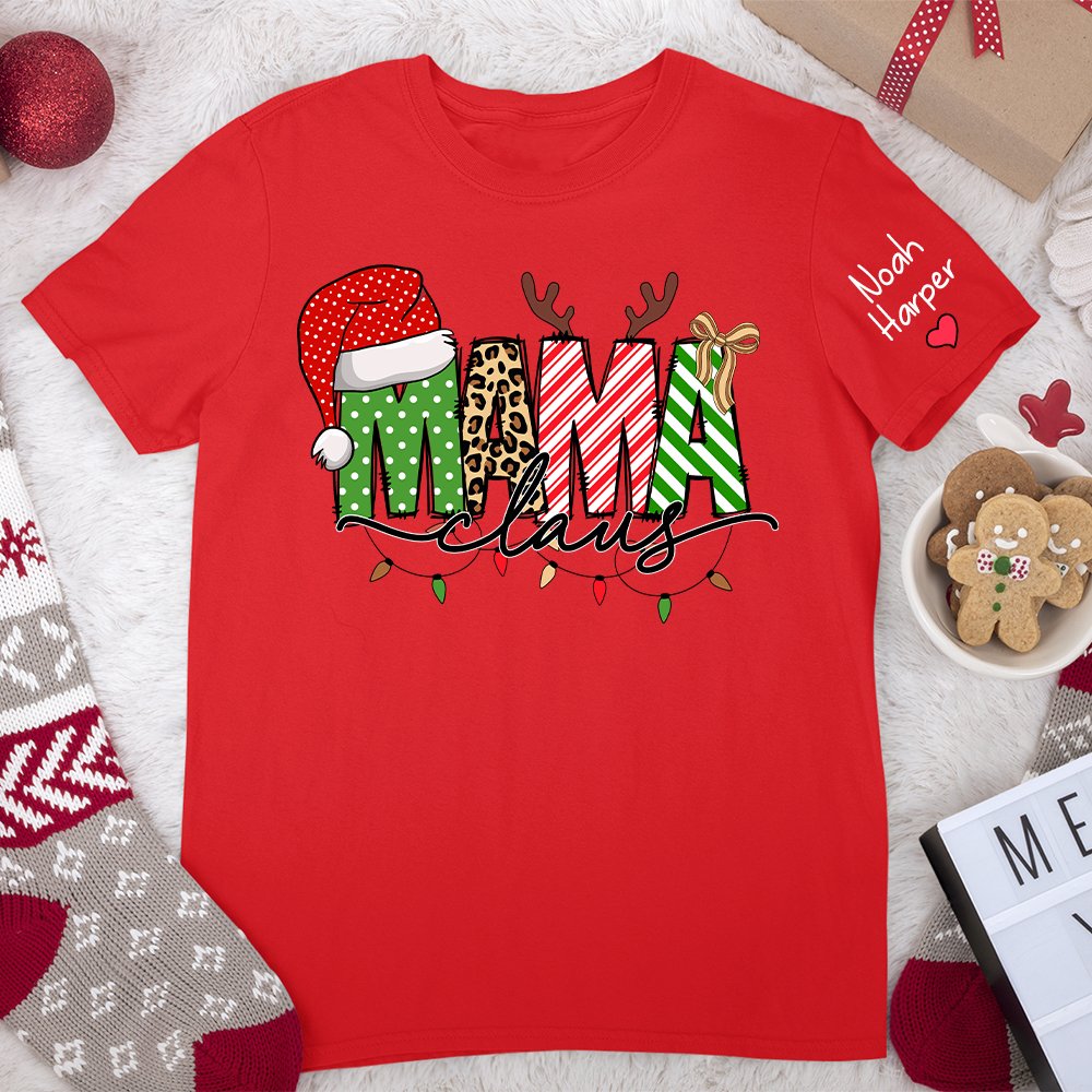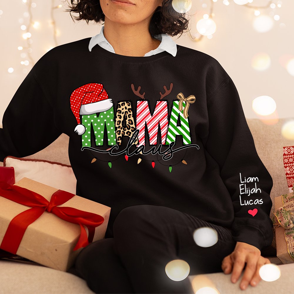 Il s'agit d'un vêtement personnalisé avec le mot "MAMA" imprimé sur la poitrine et des éléments de Noël tels qu'un chapeau de Père Noël et des bois de cerf. La manche gauche peut être personnalisée avec les noms de 1 à 15 enfants. C'est un cadeau parfait pour les mères et les grands-mères à l'occasion de Noël et de la fête des mères.