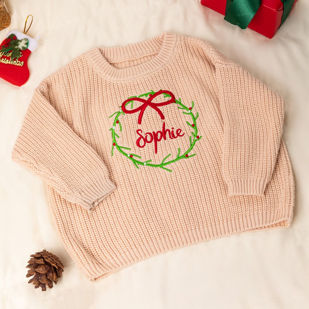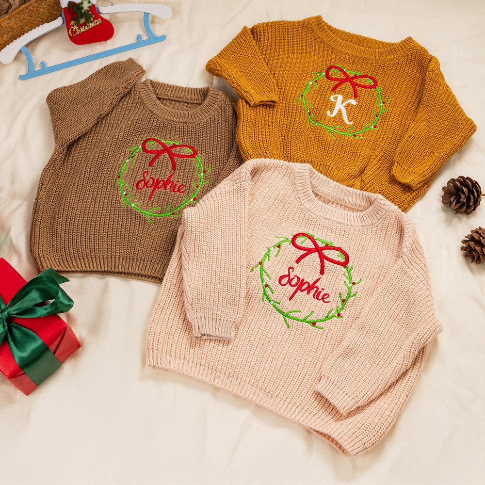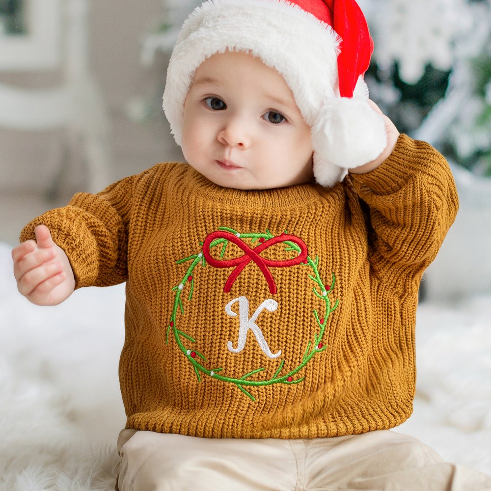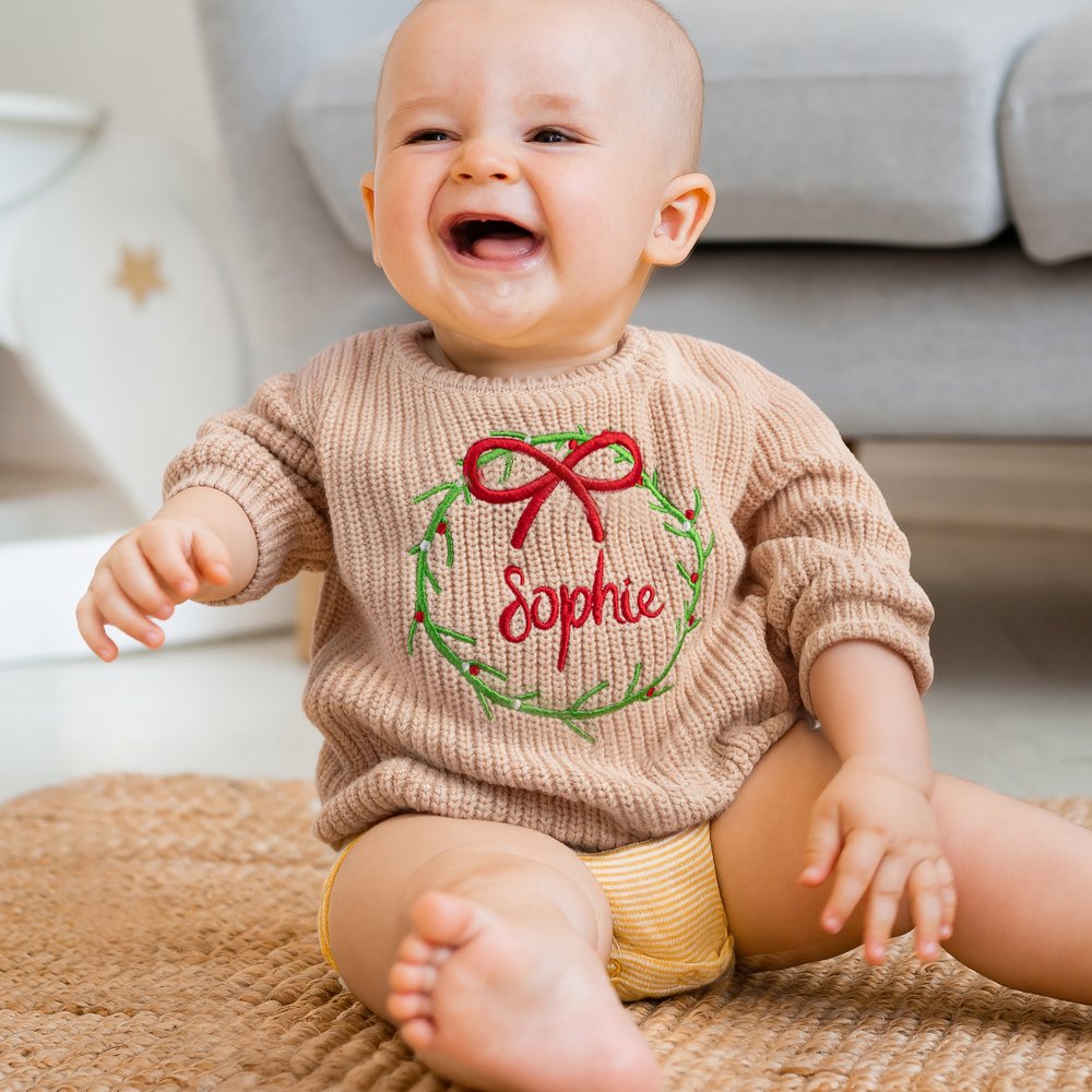 La couronne de Noël est l'élément central du design, associée à un nom de bébé brodé à la main. Disponible en plusieurs couleurs et tailles, elle allie l'esprit festif à un sentiment d'exclusivité, rendant la tenue de votre bébé unique et adorable.