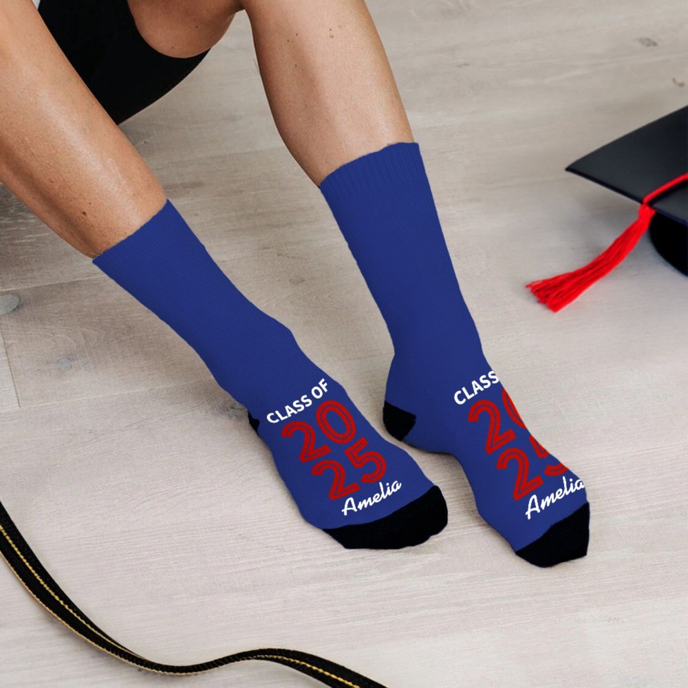 Le thème étant la commémoration de la remise des diplômes, 14 couleurs de fond (orange, rouge, etc.) sont proposées en option, associées à des couleurs d'accentuation en rapport avec l'année de remise des diplômes. Vous pouvez personnaliser l'année de remise des diplômes et le nom sur le devant, ainsi que le nom de l'université au dos, en imprimant des éléments exclusifs de remise des diplômes sur les chaussettes.
