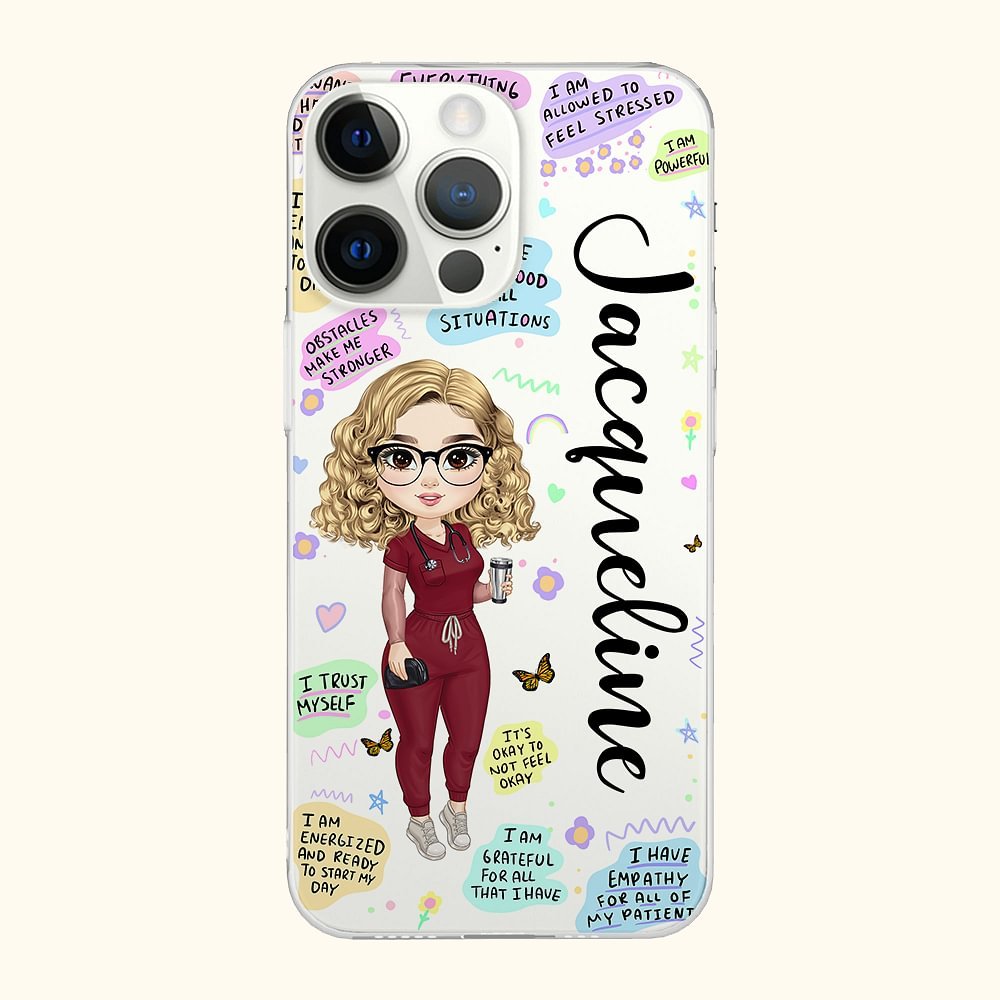 Cette housse de téléphone présente un design amusant et ludique inspiré des affirmations quotidiennes de l'infirmière, ce qui en fait un cadeau idéal pour les infirmières et les médecins.