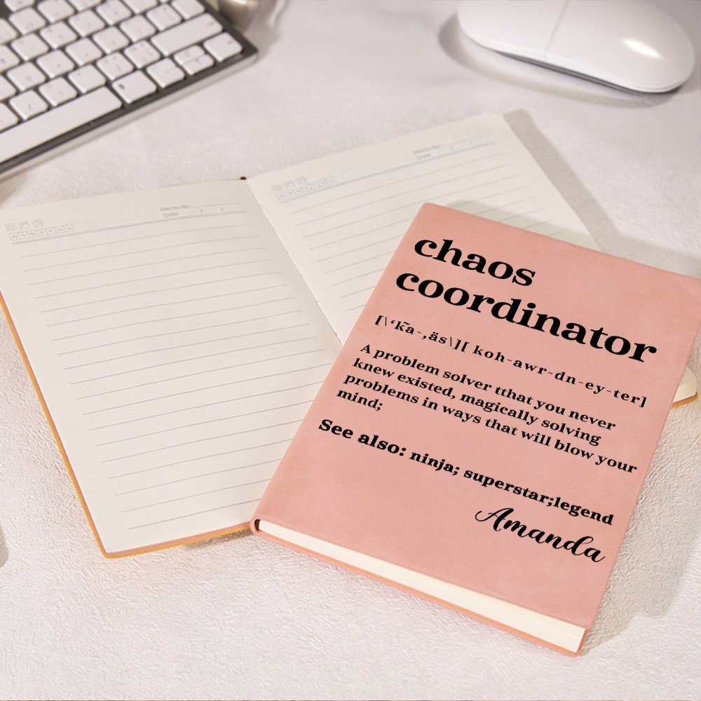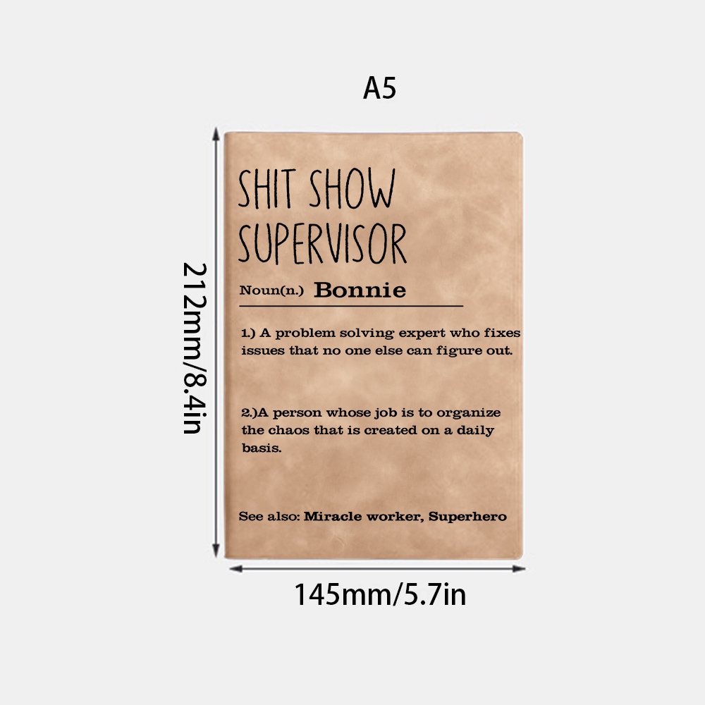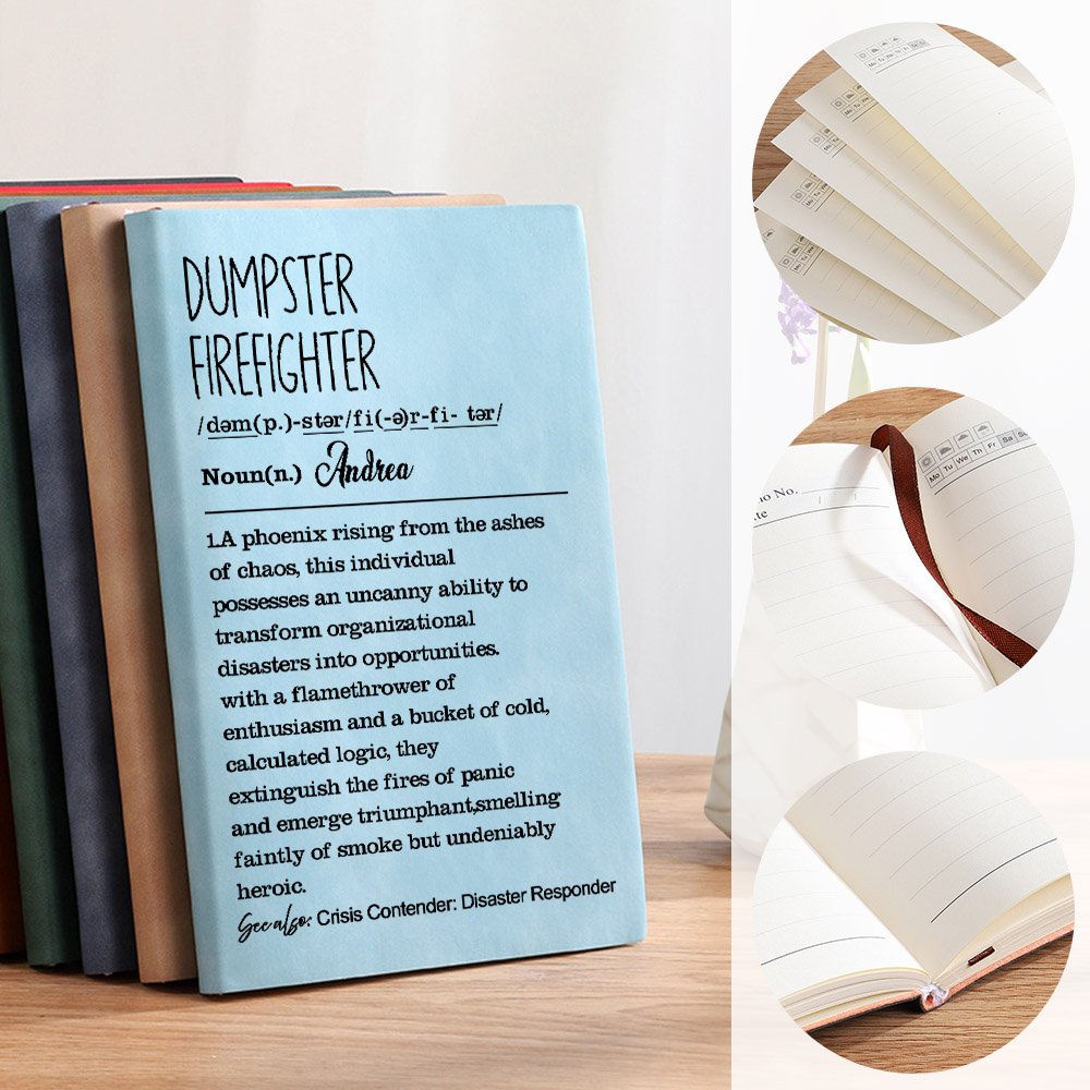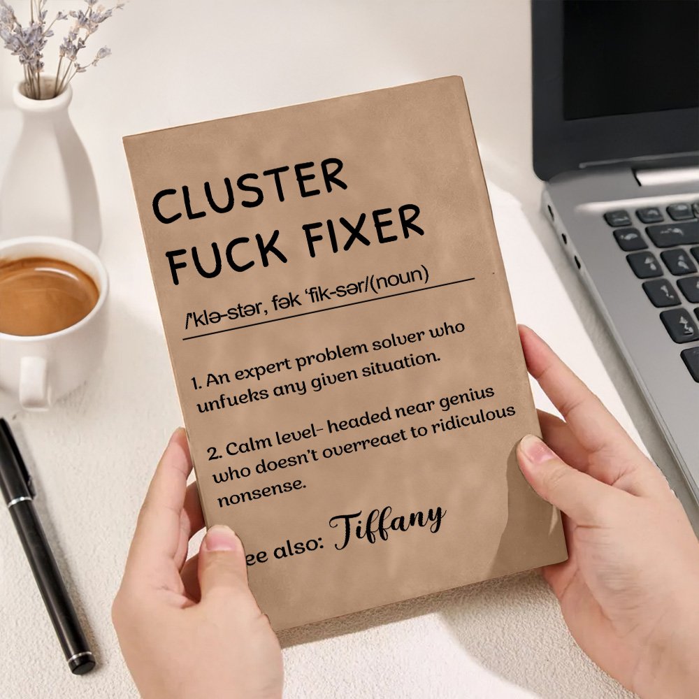 Le design de ce carnet est plein de créativité et d'humour. Il présente une série de phrases d'humour de bureau sous la forme d'entrées de dictionnaire, notamment "Cluster Fuck Fixer", "Dumpster Firefighter", "Shit Show Supervisor" et "Chaos Coordinator". Le nom peut également être personnalisé sur le carnet pour le rendre plus exclusif.