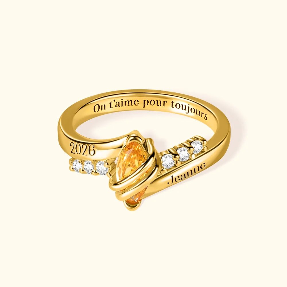 Célébrez l'amour inconditionnel d'une mère avec notre bague personnalisée, un trésor intemporel qui honore le lien précieux de la famille. Cette pièce unique vous permet de choisir une pierre de naissance symbolique et de graver des détails touchants, tels que les prénoms de ses enfants ou une date inoubliable, transformant ce bijou en un symbole éternel de vos plus beaux souvenirs partagés.