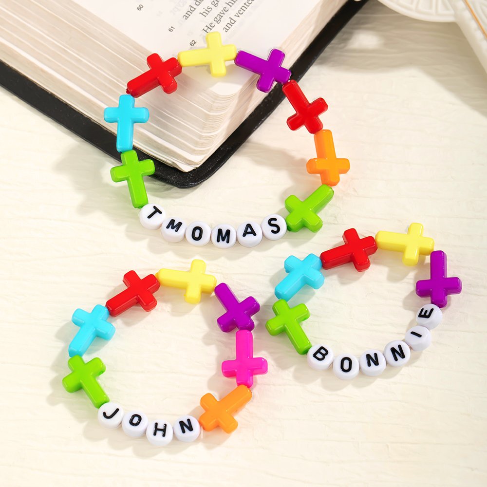 Ce bracelet est composé de croix de différentes couleurs et de perles lettres, alliant style et charme enfantin. La combinaison des perles de lettres peut être librement personnalisée. Il vous suffit d'indiquer votre nom ou celui de votre enfant pour obtenir un magnifique bracelet personnalisé.