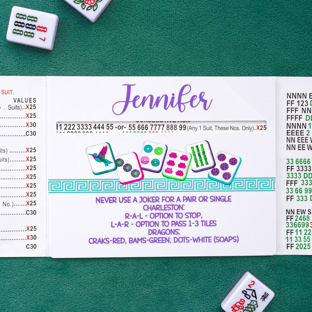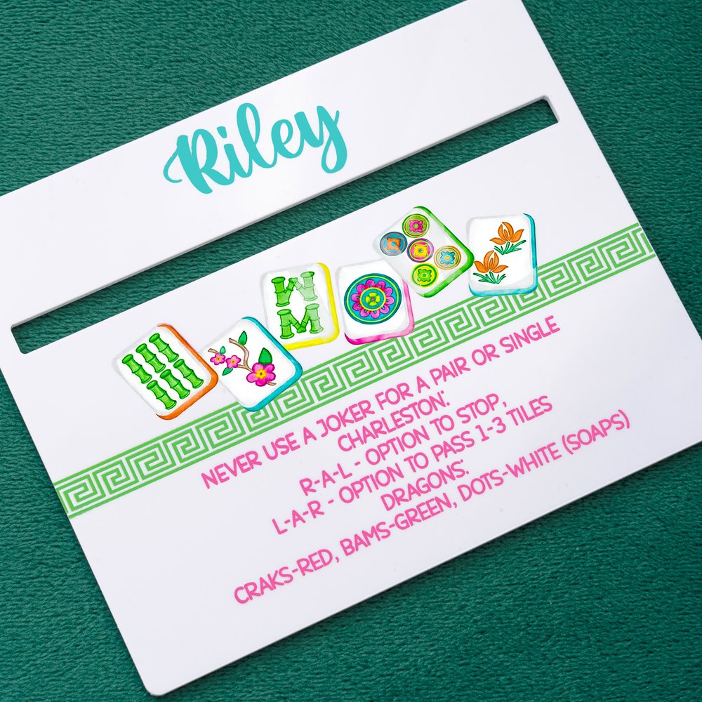 Conçu pour les amateurs de mahjong qui prennent leur jeu au sérieux. Cet outil de recherche de lignes de mahjong personnalisé présente un thème de tuiles de mahjong frais et ludique, avec un nom personnalisable imprimé directement sur la face de la tuile. Des motifs de mahjong colorés et des rappels de règles utiles sont également inclus. Le design de la fente évidée permet d'identifier avec précision les mains gagnantes ciblées tout en bloquant les tuiles adjacentes distrayantes. Disponibles en plusieurs couleurs, ces cartes sont des outils uniques et indispensables qui allient esthétique et fonctionnalité.