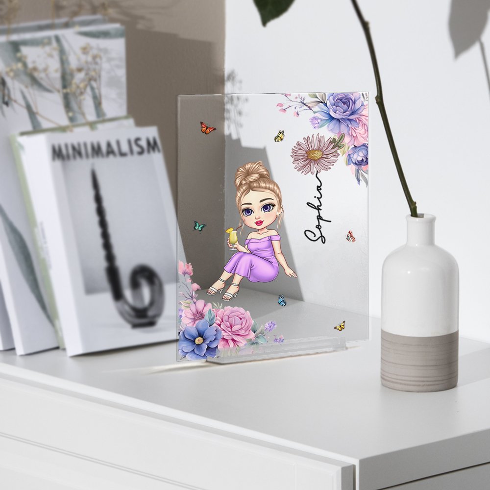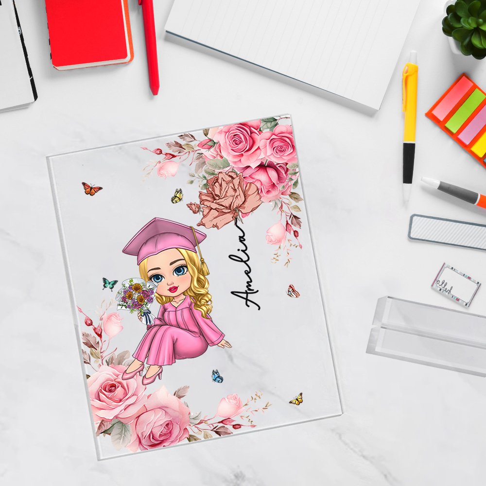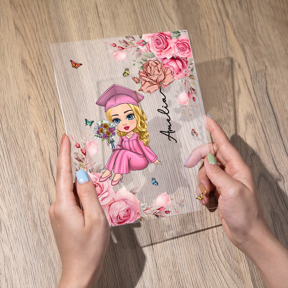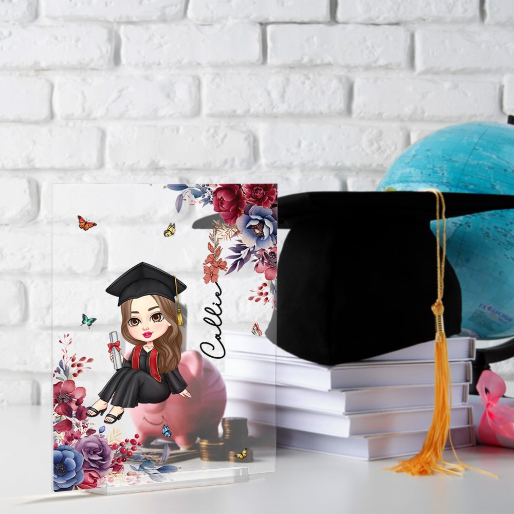 Cette plaque en acrylique a pour thème la saison des remises de diplômes et présente d'adorables personnages de dessins animés, ce qui la rend non seulement pratique mais aussi amusante. Les fleurs d'anniversaire et les noms personnalisables ajoutent une touche d'exclusivité.