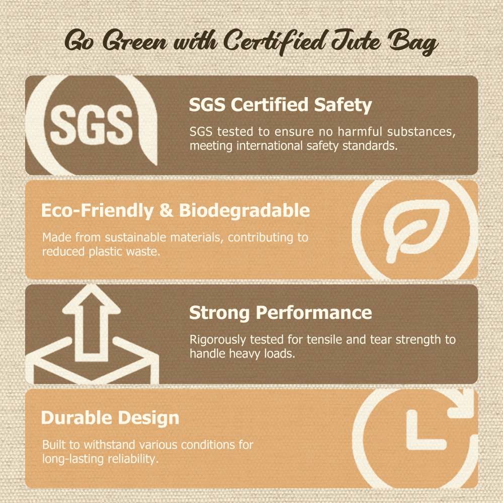 Les tissus de jute et de coton de haute qualité constituent une base solide et écologique qui garantit une résistance exceptionnelle à la traction et une durabilité durable pour un usage quotidien. La construction robuste maintient une faible extensibilité tout en offrant un excellent support pour le transport d'articles de bureau lourds. Les poignées solides permettent un transport confortable à la main. Cette production de qualité professionnelle garantit que vos graphiques restent brillants.