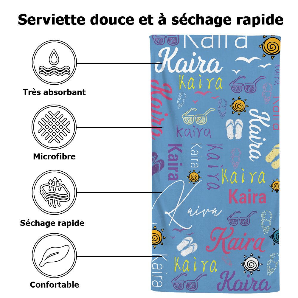 Cette serviette de plage présente des motifs estivaux, dont divers personnages artistiques, des lunettes de soleil, des mouettes, le soleil, etc. Ces motifs frais et mignons ajoutent une touche de couleur estivale à la serviette de plage. Les serviettes de plage ont également une variété de couleurs, y compris des couleurs d'été vives et des tons frais et élégants, pour répondre aux préférences et aux besoins de différentes personnes. Vous pouvez également personnaliser le nom sur la serviette de plage selon vos besoins pour la rendre encore plus unique.