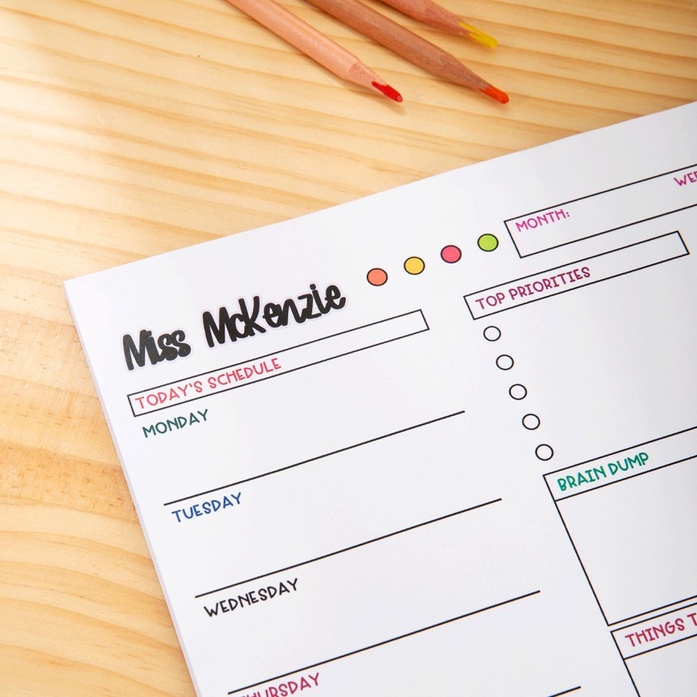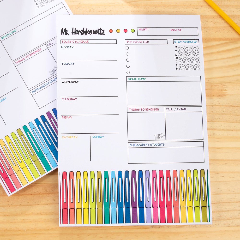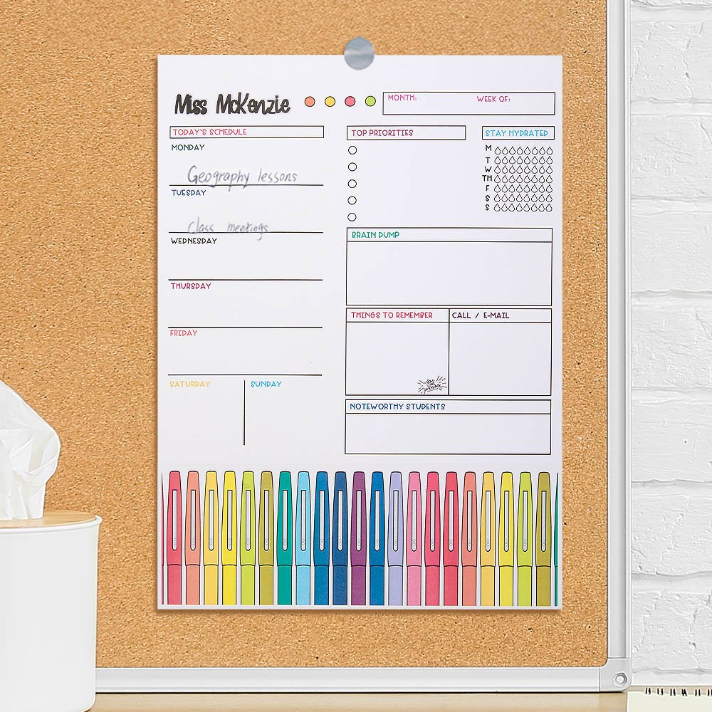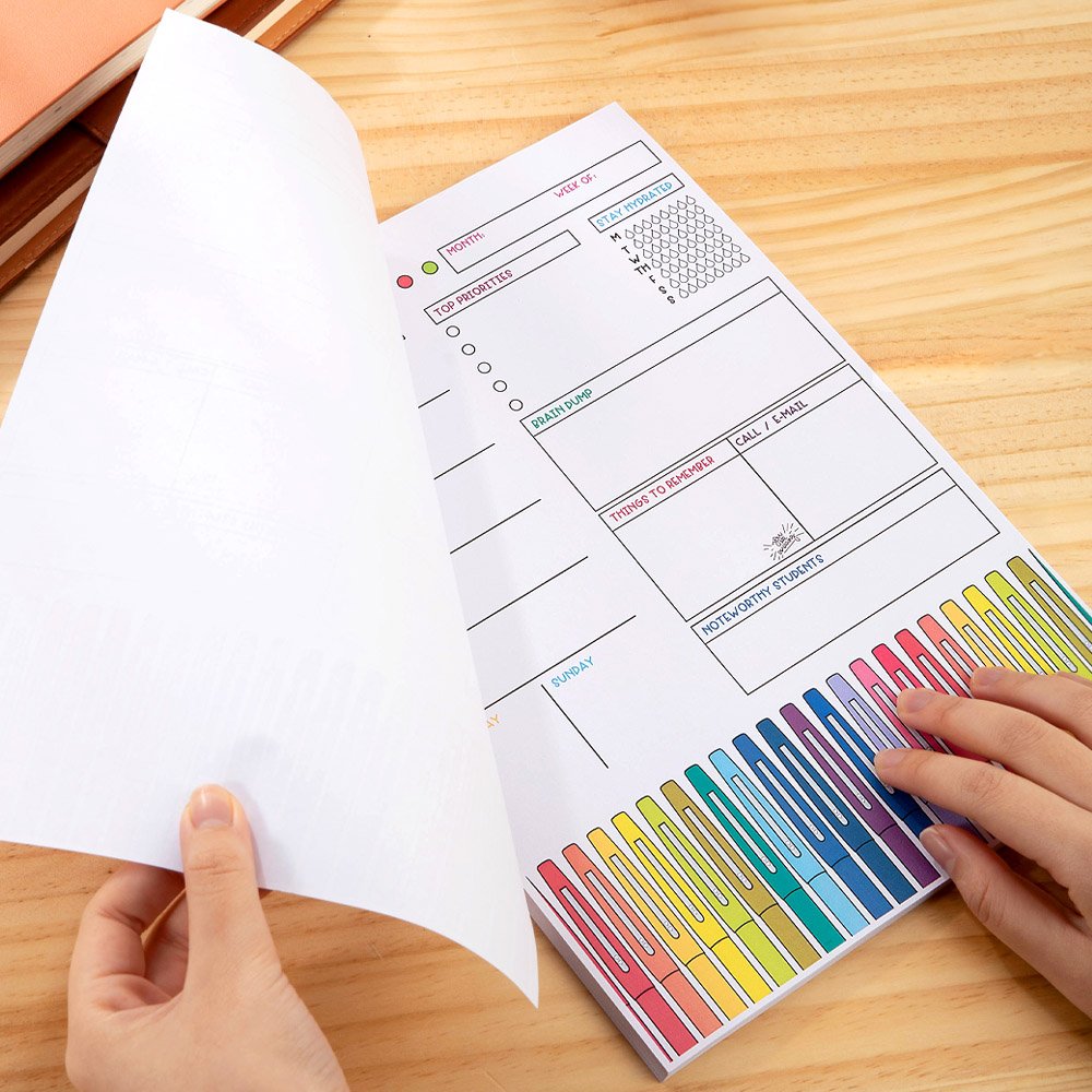 Ce bloc-notes se distingue par son design unique et coloré. Il utilise des textes aux couleurs de l'arc-en-ciel et des bords décorés de motifs colorés au feutre, ce qui lui confère une vitalité et une créativité infinies. La structure interne du bloc-notes est claire et divisée en un calendrier hebdomadaire, une liste de tâches et un espace de notes afin que les enseignants puissent facilement planifier et gérer leur emploi du temps. Vous pouvez également personnaliser les noms du bloc-notes pour les rendre plus spécifiques.