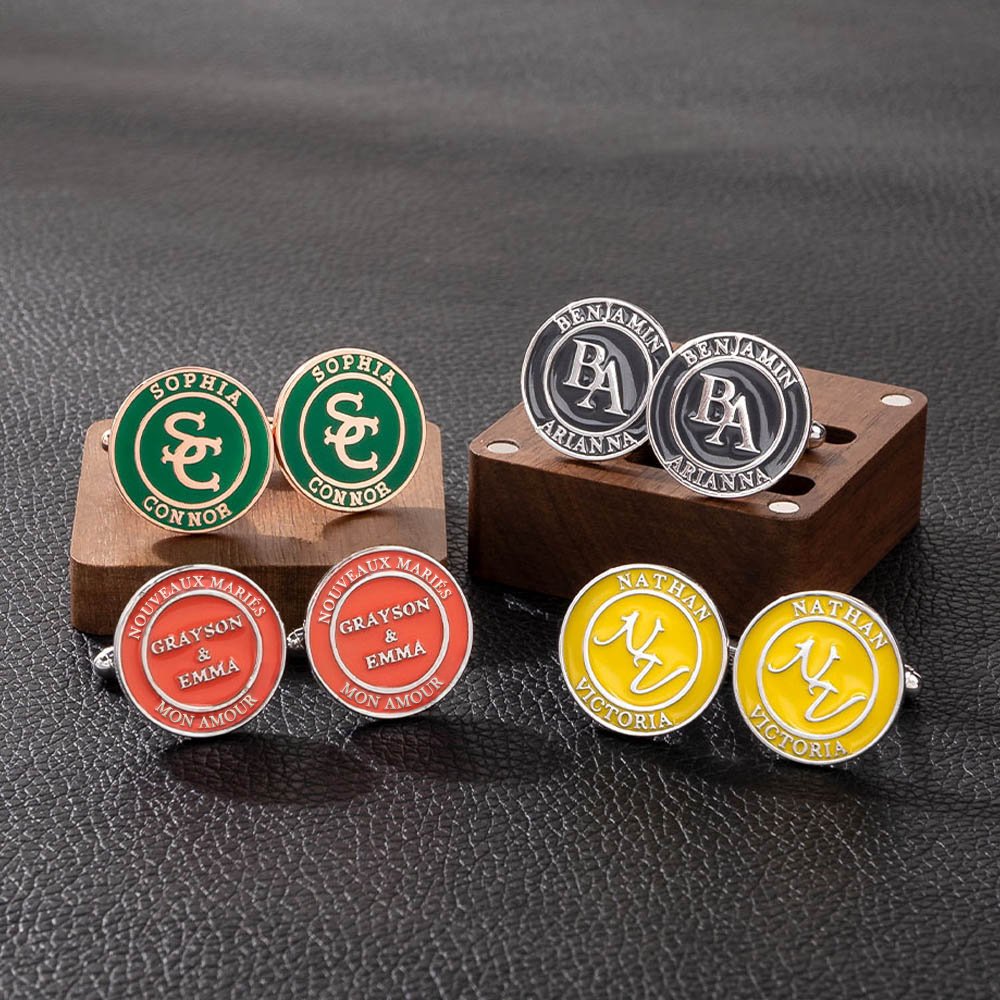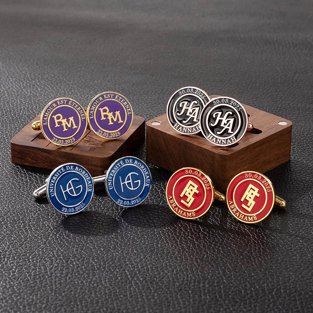 Ces boutons de manchette personnalisés présentent un design vibrant et coloré qui peut être personnalisé avec des initiales, des dates, des lieux ou tout autre message spécial. Ils font une déclaration audacieuse et ajoutent une touche de personnalité à n'importe quelle tenue formelle. La boîte peut également être personnalisée avec différents styles.