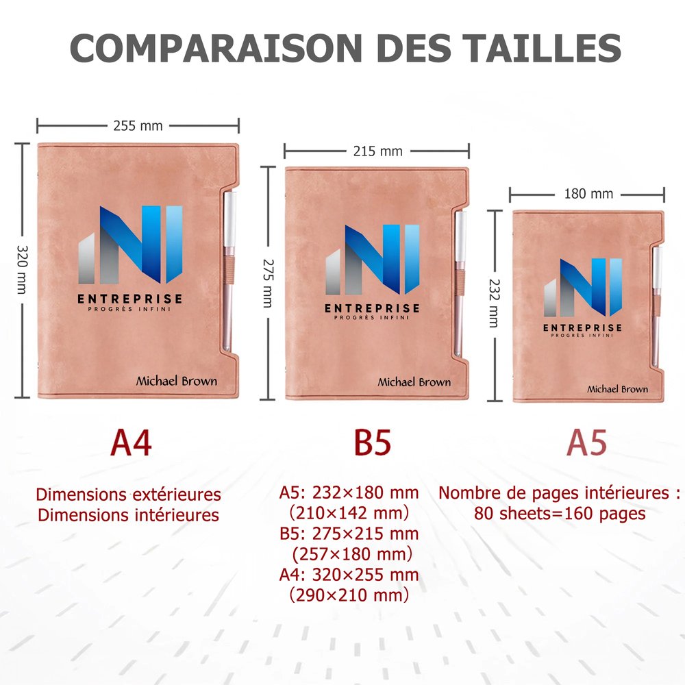 Trois formats différents (A5/B5/A4) répondent à vos différents besoins, ce qui permet de le transporter facilement dans un sac ou un sac à dos. Conçu avec une structure à feuilles mobiles, ce carnet permet de remplacer facilement les pages en cas de besoin. La pochette intégrée à la couverture est idéale pour ranger les cartes de visite ou les objets essentiels, et elle comprend un stylo supplémentaire, ce qui est pratique pour prendre des notes importantes.