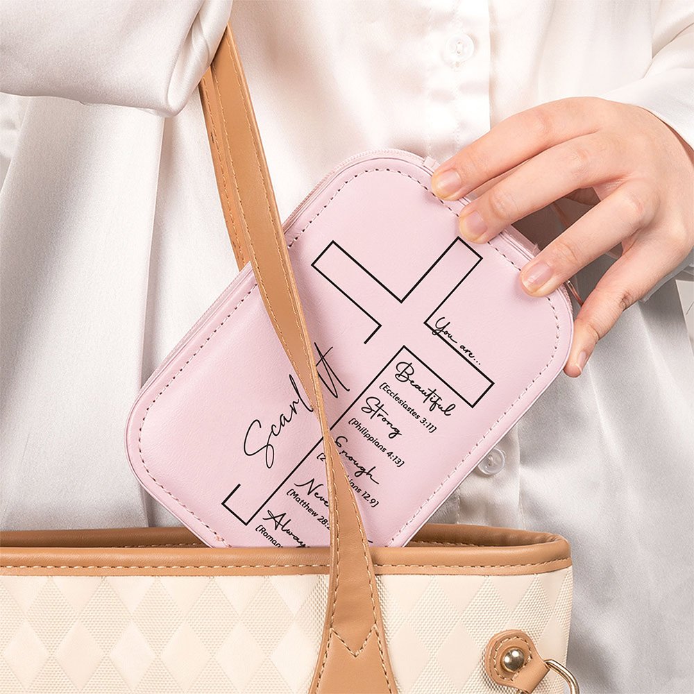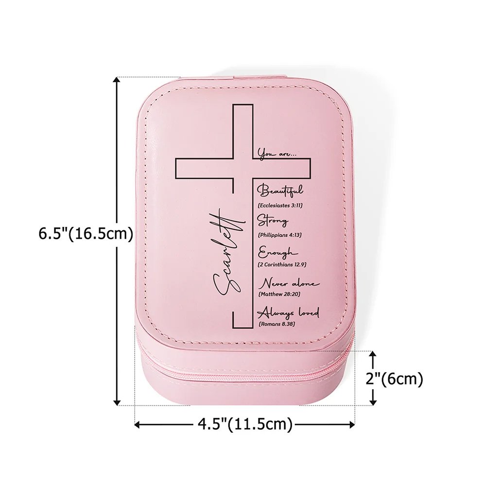 Cette boîte à bijoux présente un design simple, une croix avec un nom personnalisé et un verset biblique qui représente la foi et l'inspiration. Ces éléments ajoutent au caractère unique de la boîte et en font un support idéal pour témoigner d'une foi, d'une croissance ou d'une expérience personnelle.
