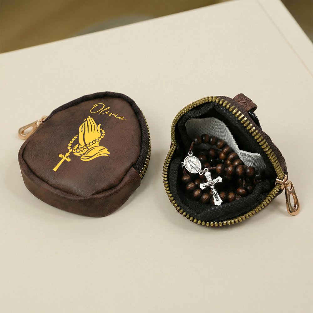 Sac de rangement pour chapelet en cuir PU avec nom Cadeau religieux de baptême pour les chrétiens