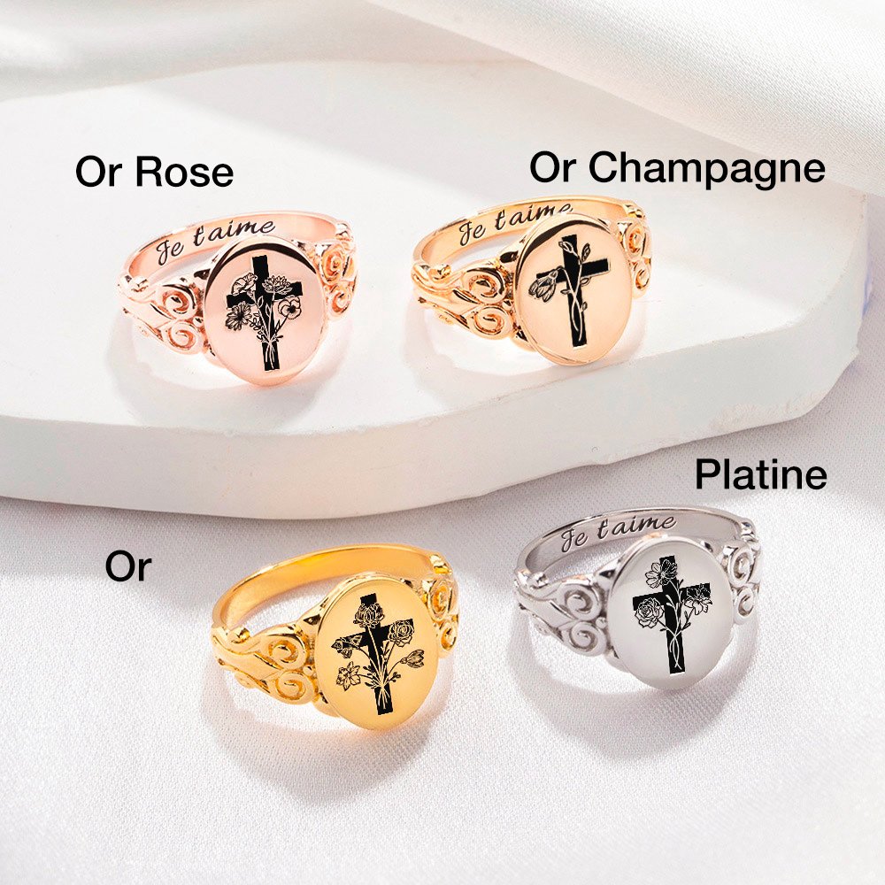 Fabriquée avec une attention méticuleuse aux détails, cette bague est le fruit d'un travail artisanal exquis. Elle est fabriquée en laiton ou en argent sterling de haute qualité, ce qui garantit sa durabilité et son aspect luxueux. Le motif complexe de la croix et le délicat bouquet de fleurs de naissance sont habilement gravés, ce qui donne un bijou époustouflant qui témoigne du dévouement et de l'art.