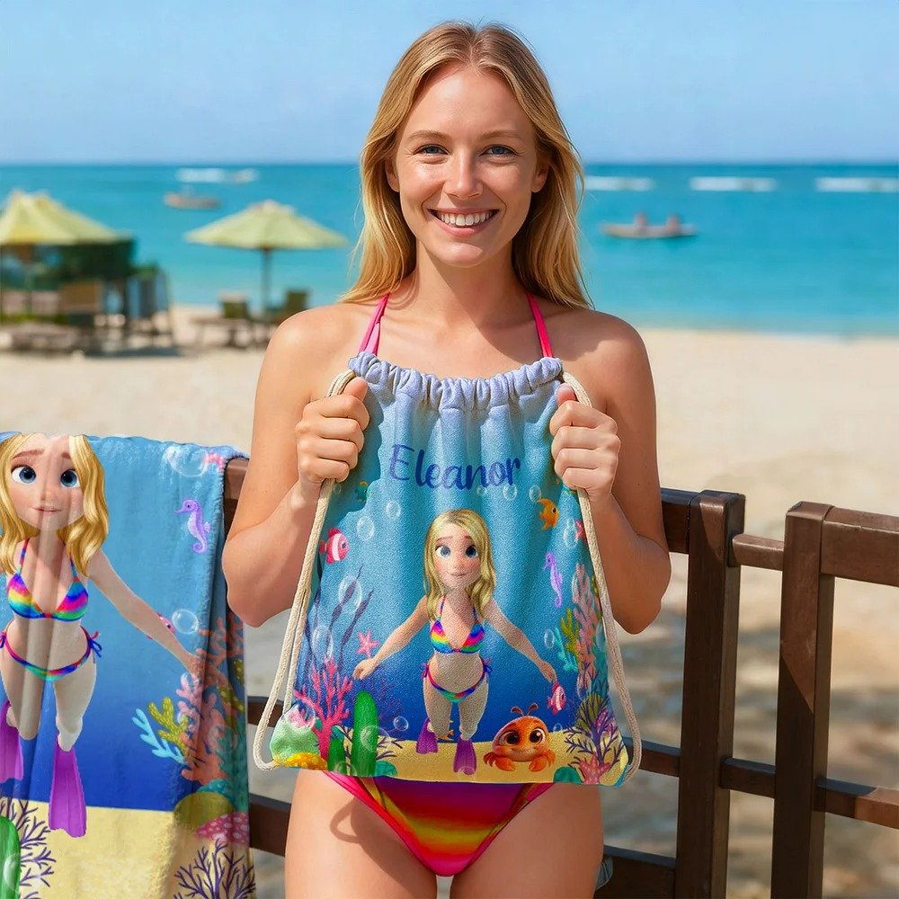 Cette serviette de plage présente de jolies images de plongée d'enfants et une variété d'animaux marins, dont des dauphins, des tortues et des poissons-clowns. Le fond est également orné de riches éléments marins, tels que des coraux et des algues, créant ainsi un monde sous-marin de rêve. La fonction de personnalisation du nom rend chaque serviette de plage unique, ce qui convient parfaitement pour montrer la personnalité des enfants.