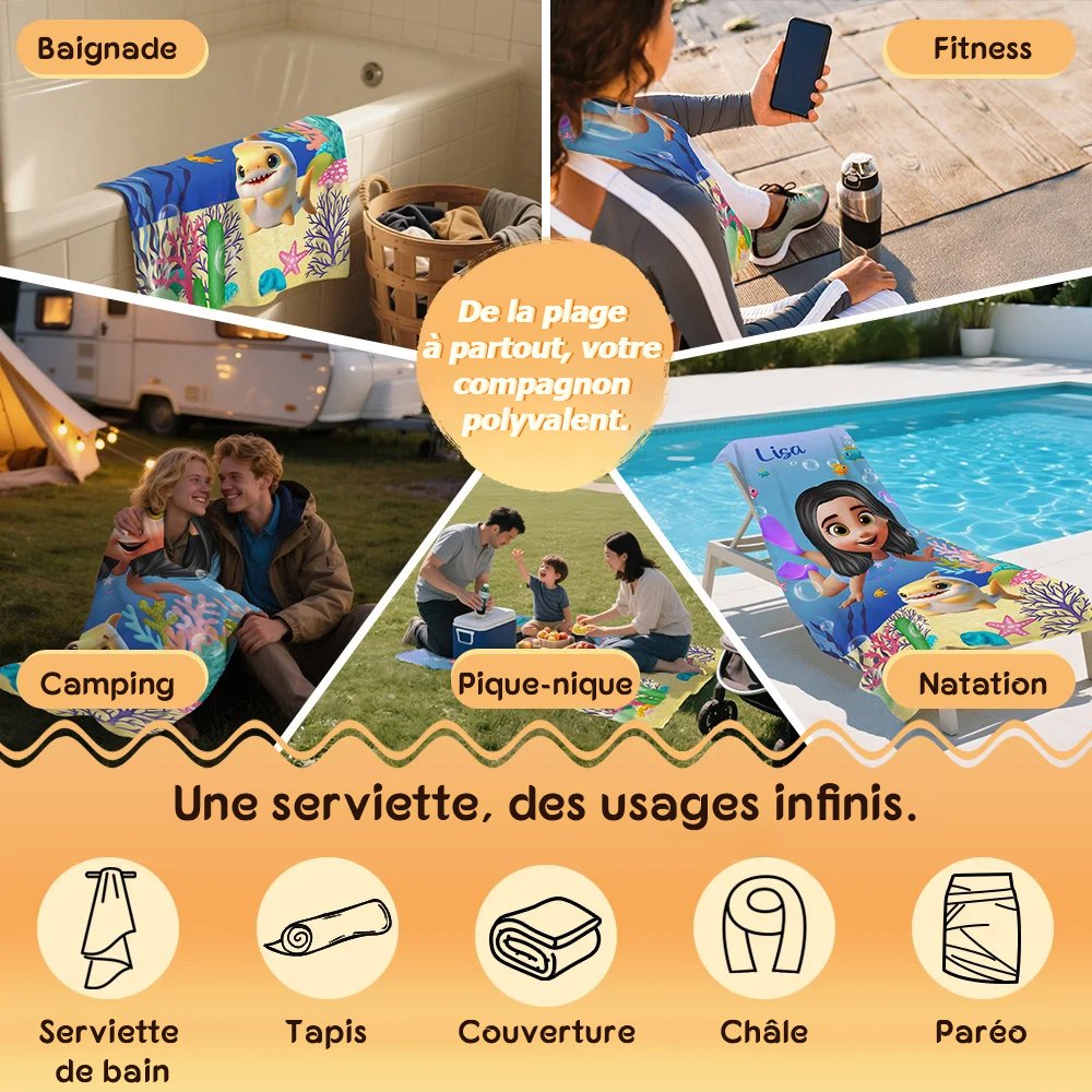 Cette serviette de plage présente de jolies images de plongée d'enfants et une variété d'animaux marins, dont des dauphins, des tortues et des poissons-clowns. Le fond est également orné de riches éléments marins, tels que des coraux et des algues, créant ainsi un monde sous-marin de rêve. La fonction de personnalisation du nom rend chaque serviette de plage unique, ce qui convient parfaitement pour montrer la personnalité des enfants.
