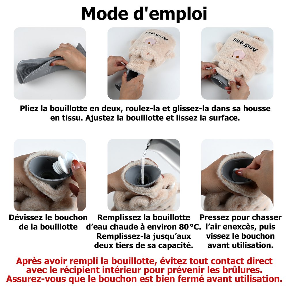 | Conseils: | - Ne convient pas aux enfants de moins de 36 mois. Pour les enfants de 36 mois et plus, utiliser uniquement sous la surveillance d'un adulte. Avertissement : Attention : Utiliser sous la surveillance d'un adulte. Une mauvaise manipulation ou un contact avec des liquides chauds peut provoquer des brûlures. Vérifier la température avant utilisation. - La housse en faux cachemire peut perdre beaucoup de fibres lors de la première utilisation. Elle peut être lavée en machine ou à la main et séchée à l'air libre avant la première utilisation. - Le revêtement intérieur de la bouillotte n'est pas optionnel ; il est expédié au hasard par le vendeur. |