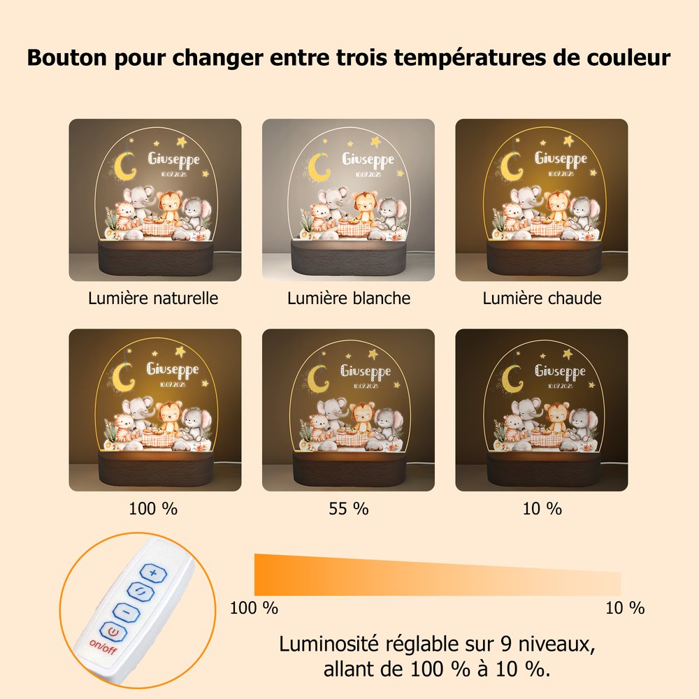 Cette veilleuse présente 6 adorables motifs d'animaux de la forêt, dont un petit éléphant, un lion et une girafe. Chaque motif est vif et enchanteur, complété par des éléments d'étoiles et de lune qui ajoutent une atmosphère de rêve à la chambre de votre enfant. Vous pouvez également la personnaliser avec le nom et la date de naissance de votre enfant, ce qui fait de chaque veilleuse un compagnon unique pour votre petit.