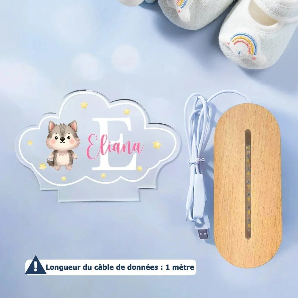 Cette veilleuse présente d'adorables animaux comme élément principal du design, combinant des couleurs vibrantes avec une forme fantaisiste ressemblant à un nuage que les enfants adorent. Vous pouvez également personnaliser les initiales et les noms pour ajouter une touche personnelle. Ce design ludique permet non seulement de s'amuser, mais aussi d'apporter de la chaleur et une atmosphère de rêve à chaque nuit.