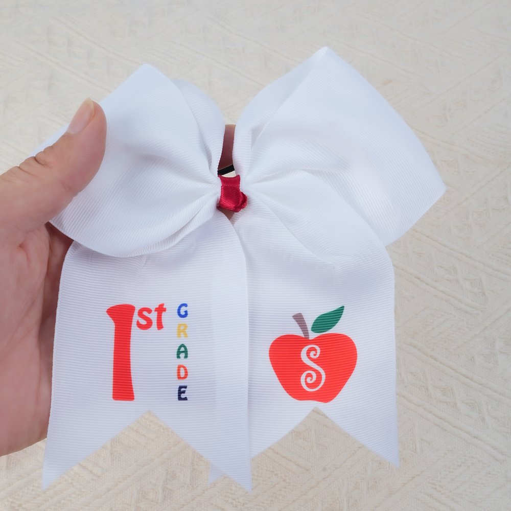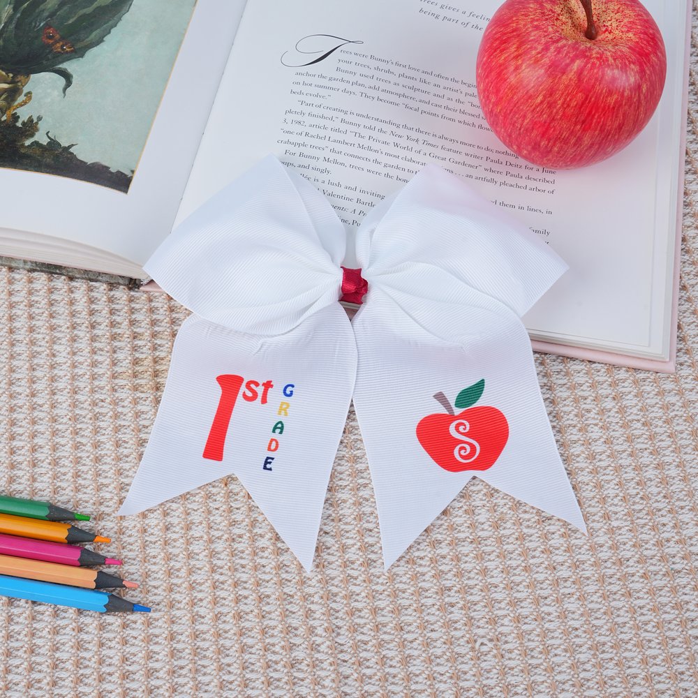 Le nœud de cheveux allie le symbolisme ludique de l'école (pomme, texte de classe) à un motif personnalisé. La forme large du nœud, les couleurs vives et les détails personnalisés créent un style joyeux et adapté aux enfants, parfait pour célébrer le début de l'année scolaire et faire en sorte que l'enfant se sente confiant et élégant.