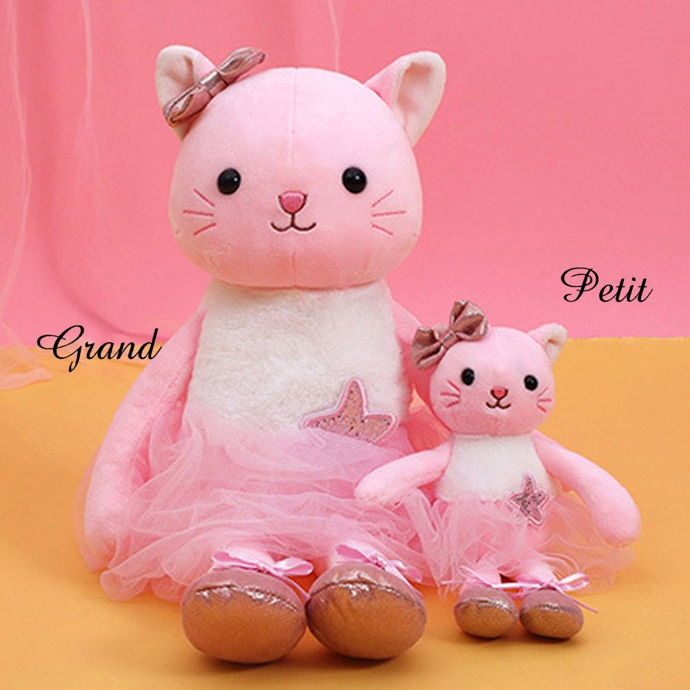 Notre peluche présente trois charmants personnages : un lapin ballerine, un chat ballerine et une souris ballerine. Chaque peluche est vêtue de chaussons de danse argentés et d'une robe en tulle pailletée, étincelante et éblouissante.