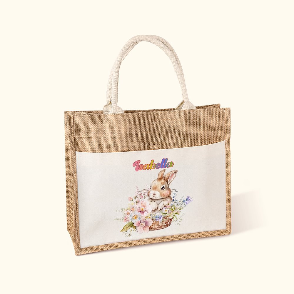 Le sac fourre-tout présente un charmant motif de bouquet de lapins, rempli de lapins mignons et espiègles avec des fleurs colorées. Vous pouvez le personnaliser avec un nom pour le rendre vraiment spécial et unique.