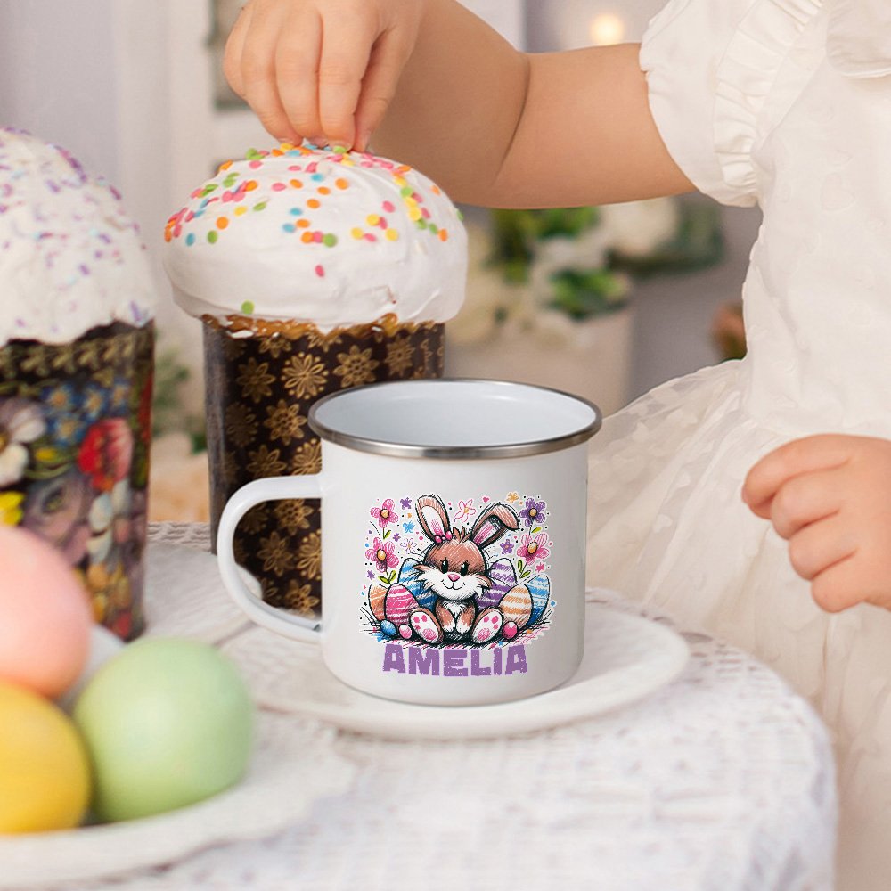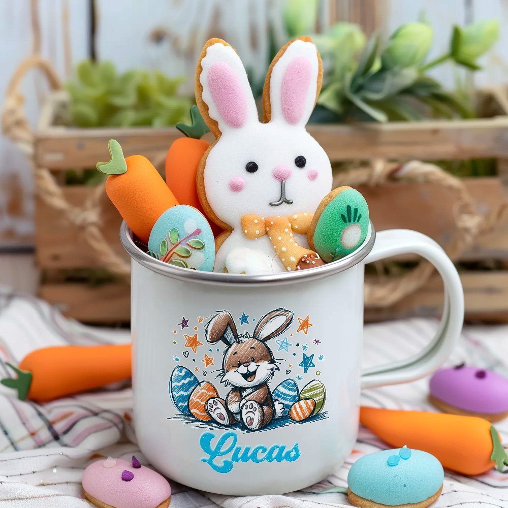 Les mugs en émail sont imprimés de mignons petits animaux avec des oreilles de lapin, ajoutant une atmosphère festive aux événements de Pâques ou aux fêtes. Choisissez parmi 26 motifs différents. Vous pouvez également personnaliser le nom sur le mug en émail pour le rendre encore plus spécial. Il s'agit non seulement d'un récipient pratique pour boire, mais aussi d'un souvenir personnalisé. Ces petites tasses en émail sont parfaites pour les enfants qui les trouveront dans les paniers de Pâques.