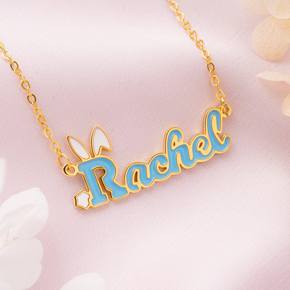 Ce collier-pendentif présente un nom personnalisé mignon et coloré, dont l'initiale majuscule est ornée d'oreilles et d'une queue de lapin, ce qui lui confère un style ludique et plein de vie. Avec jusqu'à 10 options de couleurs pour le nom, il répond aux différentes préférences des enfants.
