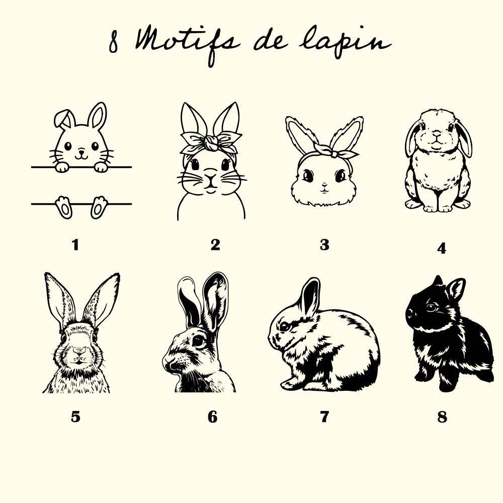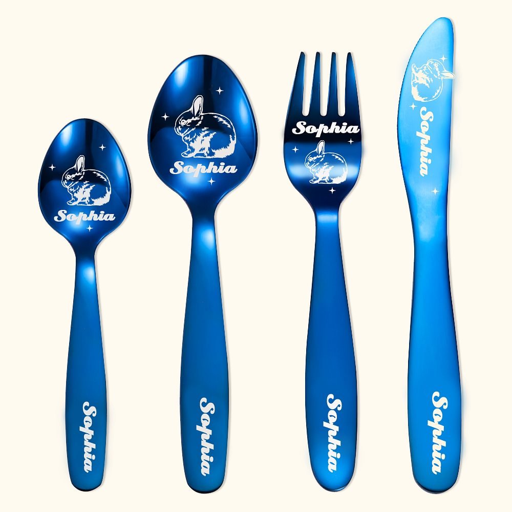 La vaisselle peut être personnalisée avec n'importe quel nom ou mot dans une limite de 10 caractères. En outre, vous pouvez également choisir votre motif de lapin préféré et la couleur des couverts.