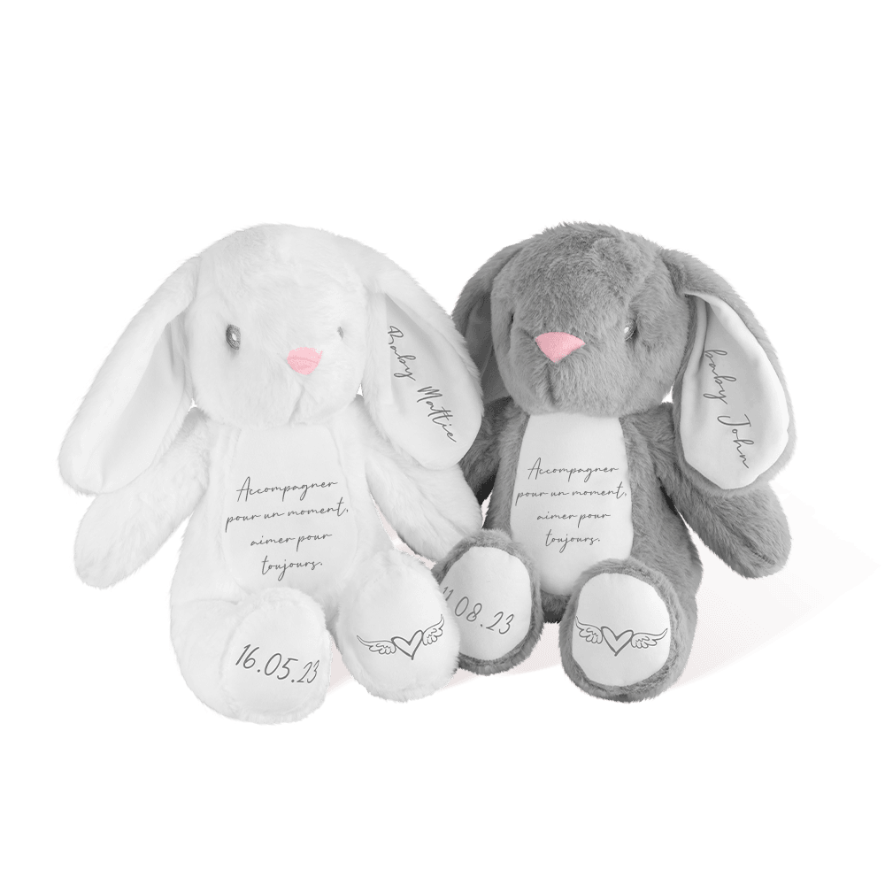 Le texte "Carried for a moment, loved for a lifetime" sur le ventre du lapin et le motif de cœur ailé sur la patte gauche du lapin sont fixes.
