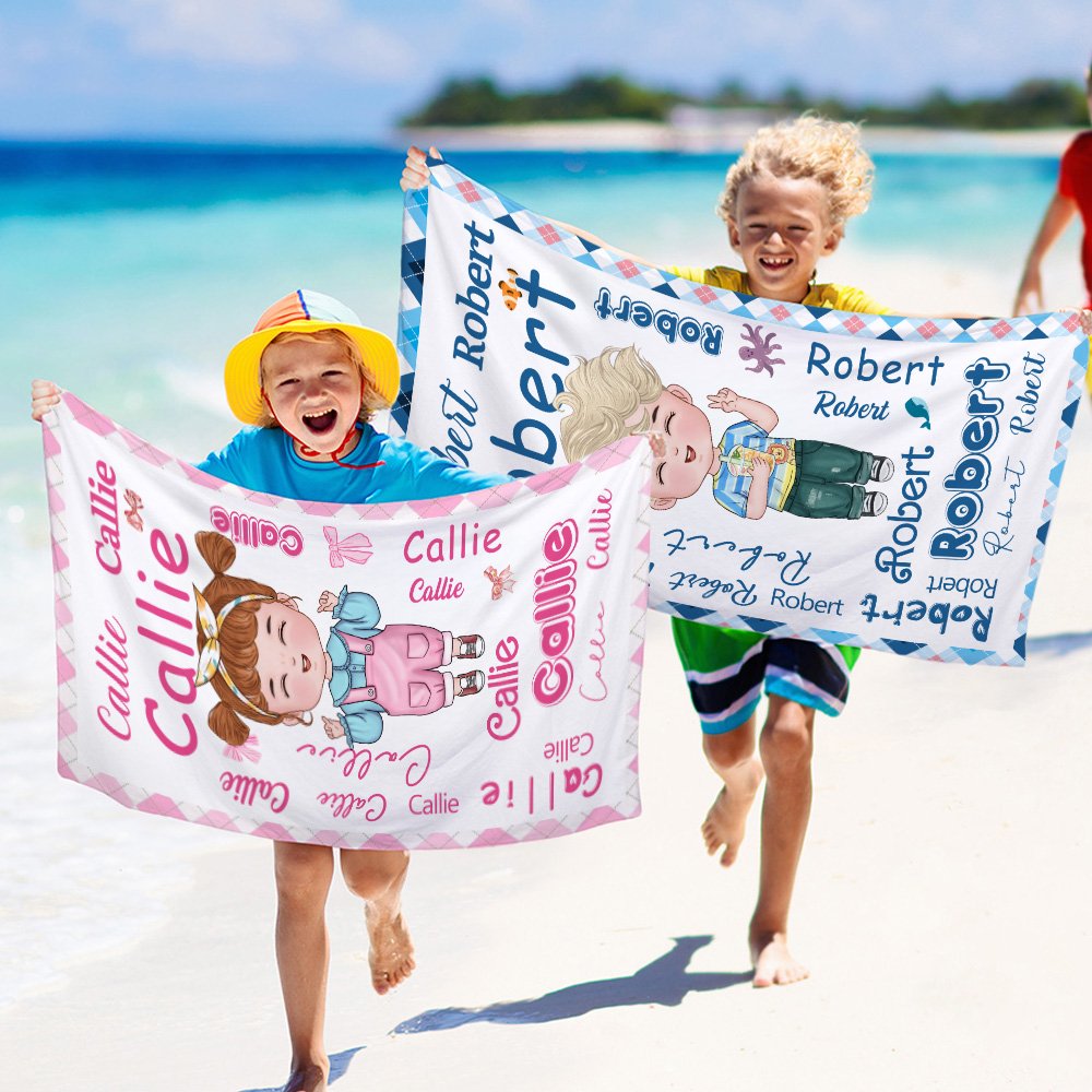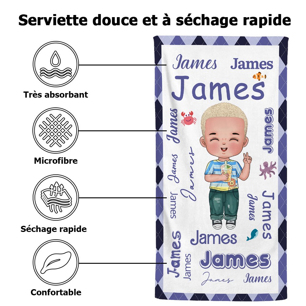 Cette serviette de plage comporte un nom sous forme de nuage de mots et un mignon personnage de dessin animé. Les utilisateurs peuvent personnaliser leur sexe, leur coiffure, la couleur de leurs cheveux, leurs vêtements, la couleur de leur peau et la couleur de leurs yeux. Vous avez le choix entre 8 motifs de damier en diamant, mais vous pouvez également choisir un motif de nœud ou de vie marine, qui est plein d'innocence enfantine et que vos enfants vont certainement adorer.