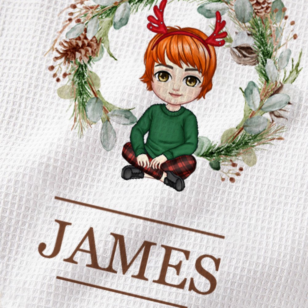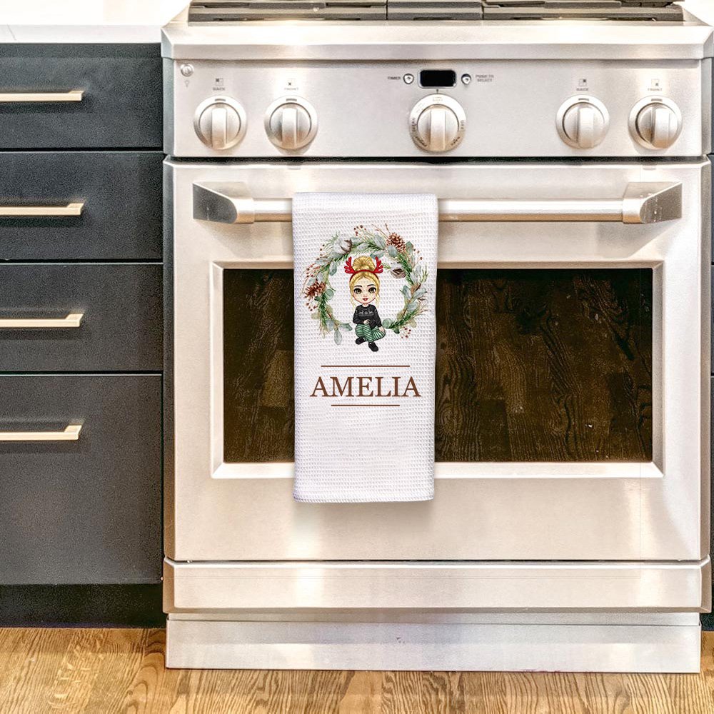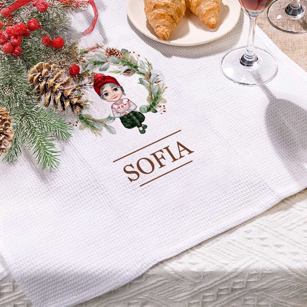 Le motif représente un charmant personnage de dessin animé associé à une magnifique couronne de Noël, ce qui en fait une pièce vraiment personnelle et significative. La texture gaufrée ajoute une touche unique et élégante au torchon. Le nom figurant sur le torchon peut être personnalisé, ce qui en fait un excellent cadeau.