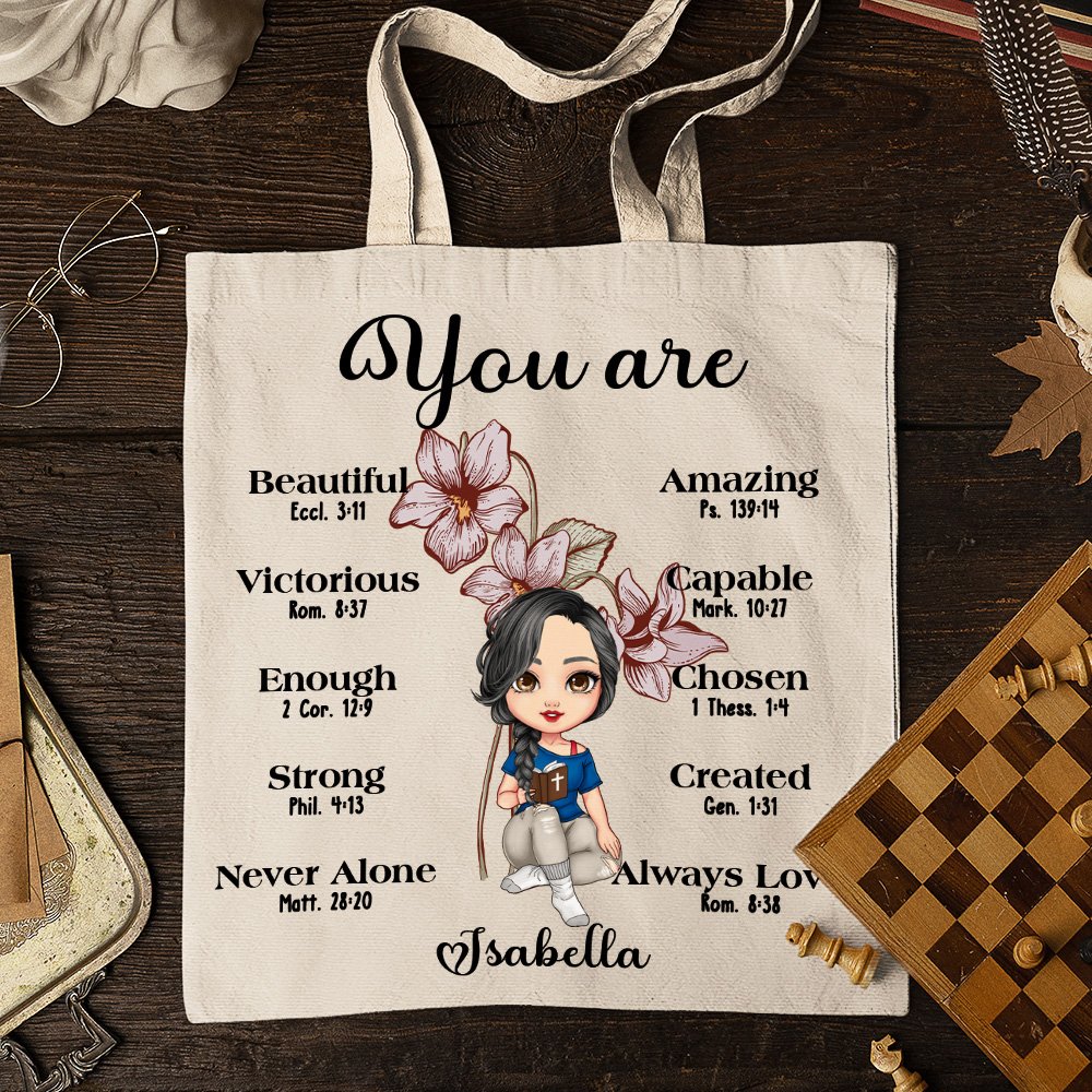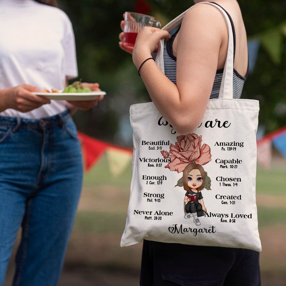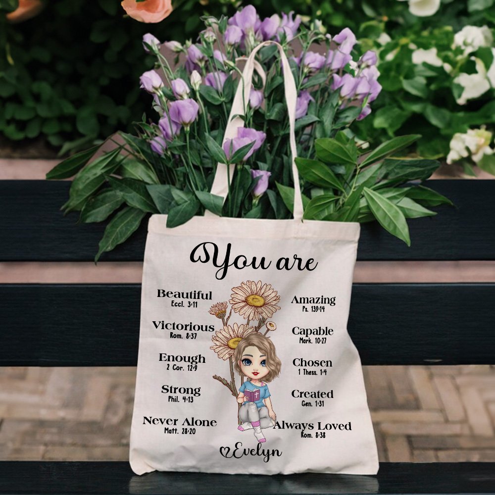Ce sac fourre-tout en toile est orné d'une charmante illustration de fille de bande dessinée et d'un magnifique motif de fleur de naissance. Personnalisé avec un nom, il constitue un accessoire unique et significatif. L'adorable personnage, le symbolisme de la fleur de naissance et la personnalité font de ce sac un objet spécial qui résonne avec l'identité et la foi de son propriétaire.