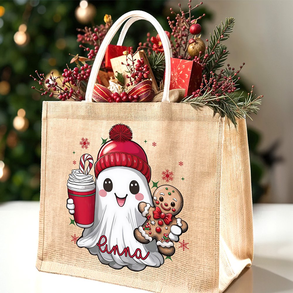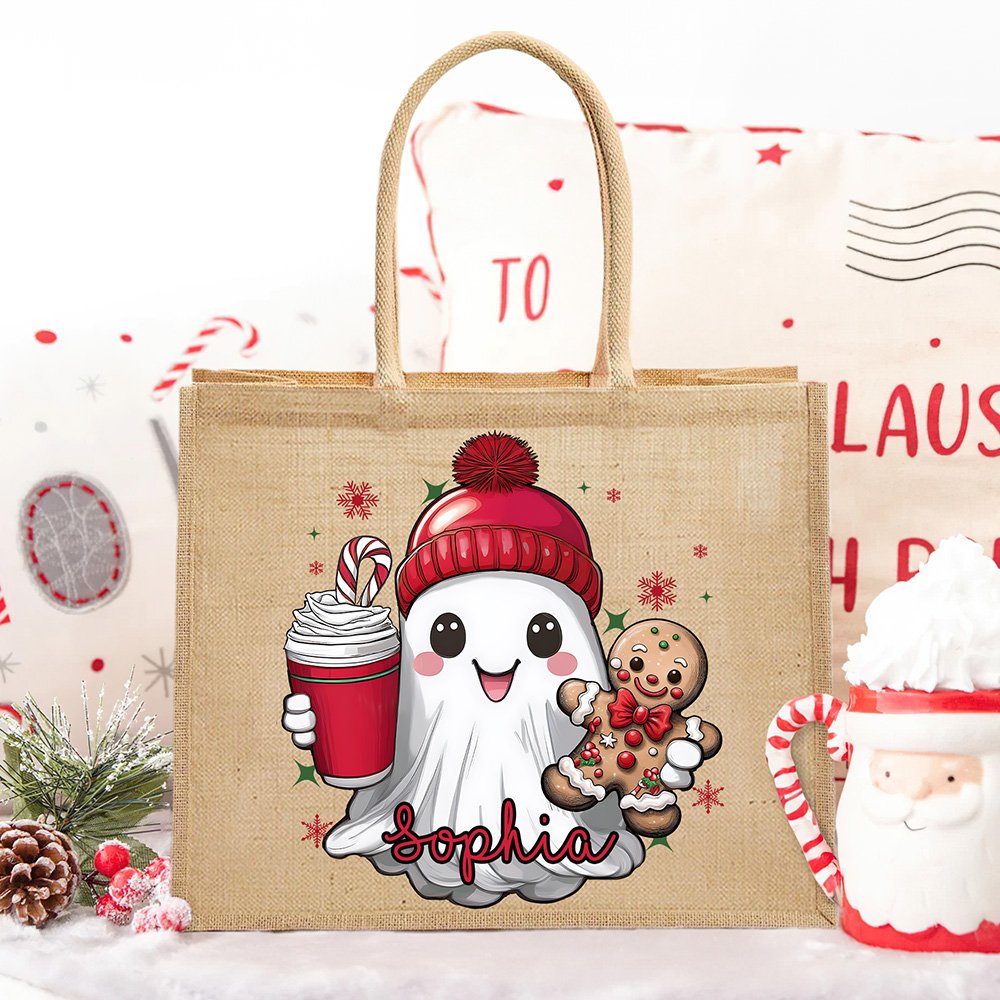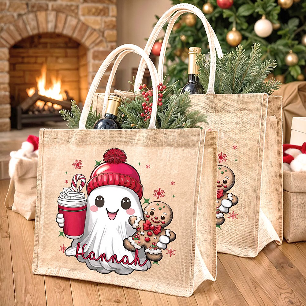 Ce sac en toile de jute personnalisable représente un adorable fantôme de Noël coiffé d'un chapeau de fête, entouré d'éléments ludiques comme des bonshommes de pain d'épices, des cannes à sucre et des flocons de neige. Son design charmant capture parfaitement l'esprit joyeux de Noël.