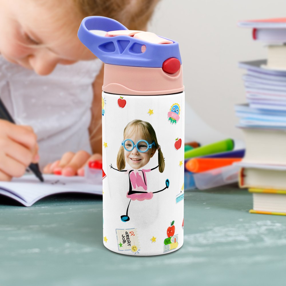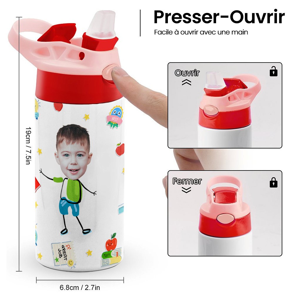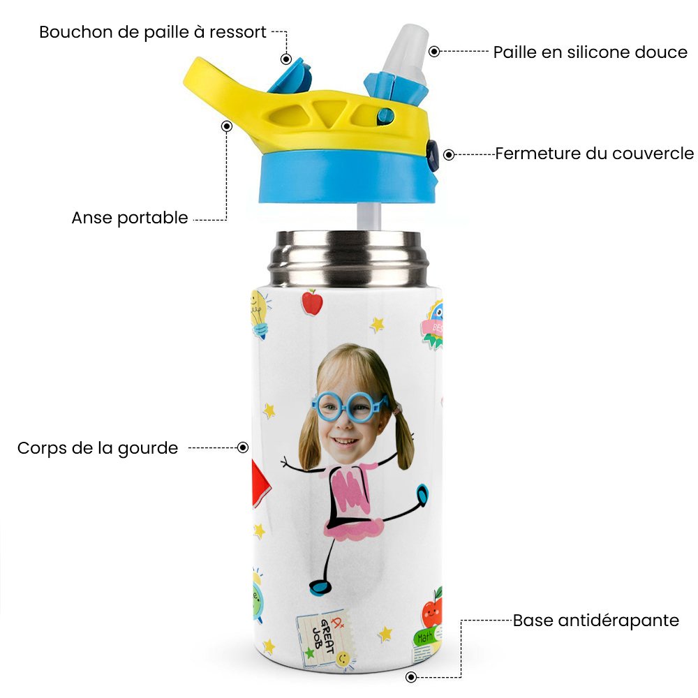 Rendez cette gourde spéciale en la personnalisant avec le nom, l'initiale et la photo de l'enfant. Cette personnalisation rend la bouteille unique et aide les enfants à identifier facilement leur bouteille, entre autres.