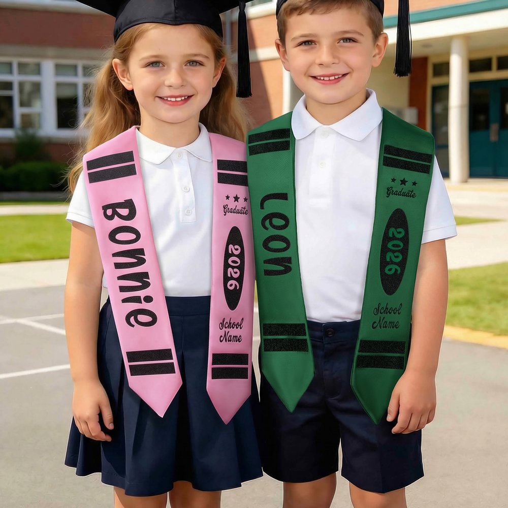 Dotées d'adorables éléments en crayons de couleur et d'un texte pailleté accrocheur, ces écharpes peuvent être personnalisées avec l'année de remise des diplômes, le nom de l'enfant et le nom de l'école. Leur design vif et lumineux évoque l'innocence de l'enfant et la cérémonie de remise des diplômes.