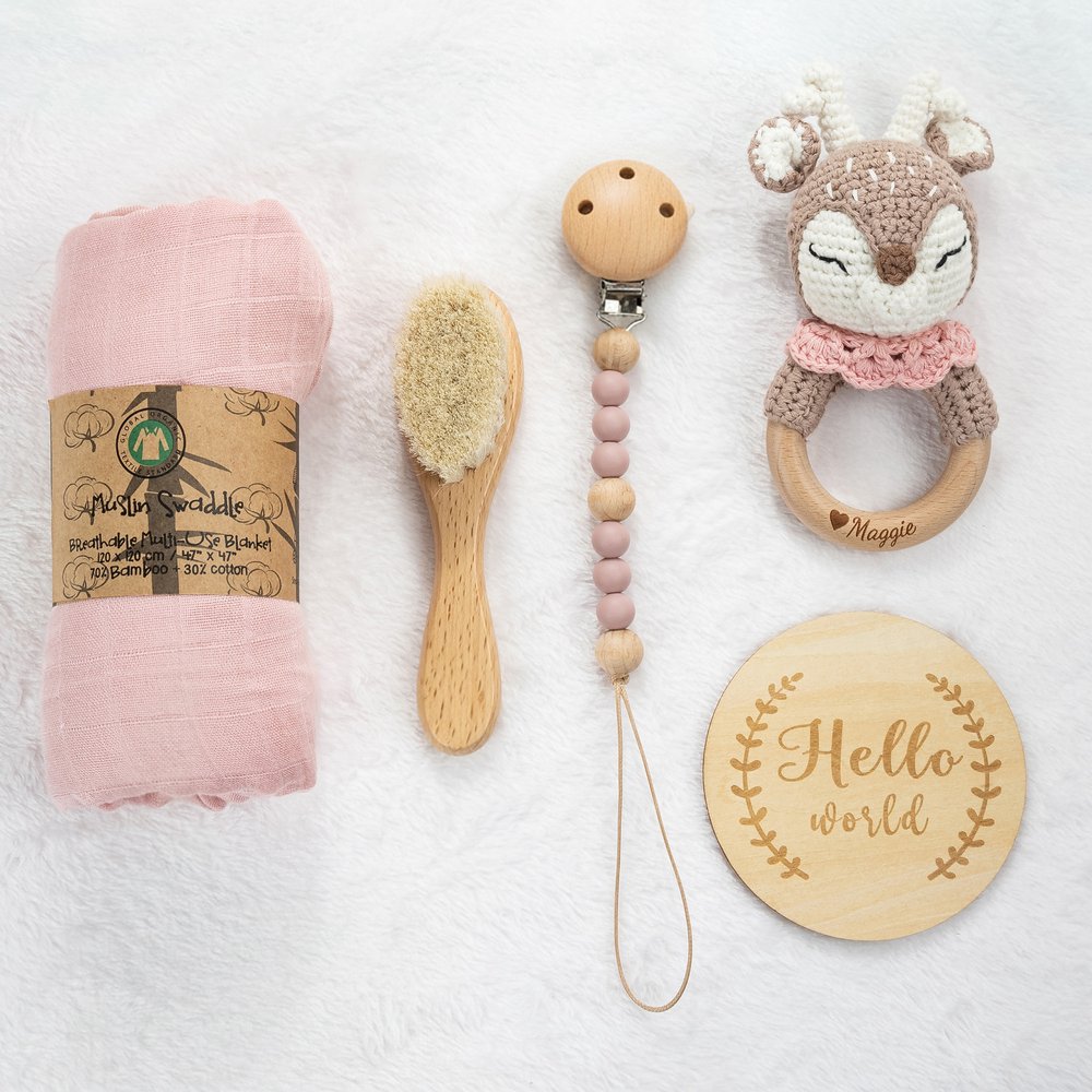 Nous contrôlons rigoureusement la qualité à chaque étape afin de garantir une sécurité absolue pour la peau de votre bébé. Le tissu crocheté est en coton de première qualité, doux et non irritant. La poignée du hochet en bois naturel et le panneau d'annonce de la naissance sont fabriqués en bois de hêtre de première qualité, ce qui les rend durables et faciles à nettoyer. L'emmaillotage est en 100 % coton, ce qui permet d'évacuer l'humidité et de respirer. Le peigne est en laine douce, qui respecte la peau délicate de votre bébé. L'attache-sucette au crochet est en silicone doux et en bois de hêtre de première qualité, non toxique et inoffensif.