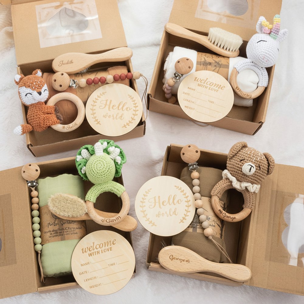Inspiré par l'imagination du doux monde d'un nouveau-né. Chaque pièce est empreinte d'une ingéniosité unique et d'une espièglerie enfantine. Le hochet animal au crochet présente d'adorables formes d'animaux en trois dimensions. La poignée du hochet peut être personnalisée avec le nom de votre bébé. Sont également inclus une couverture d'emmaillotage, un peigne, un panneau d'annonce de naissance "Hello, World" et un attache-sucette. Le design général crée une atmosphère pure, chaleureuse et bienveillante.