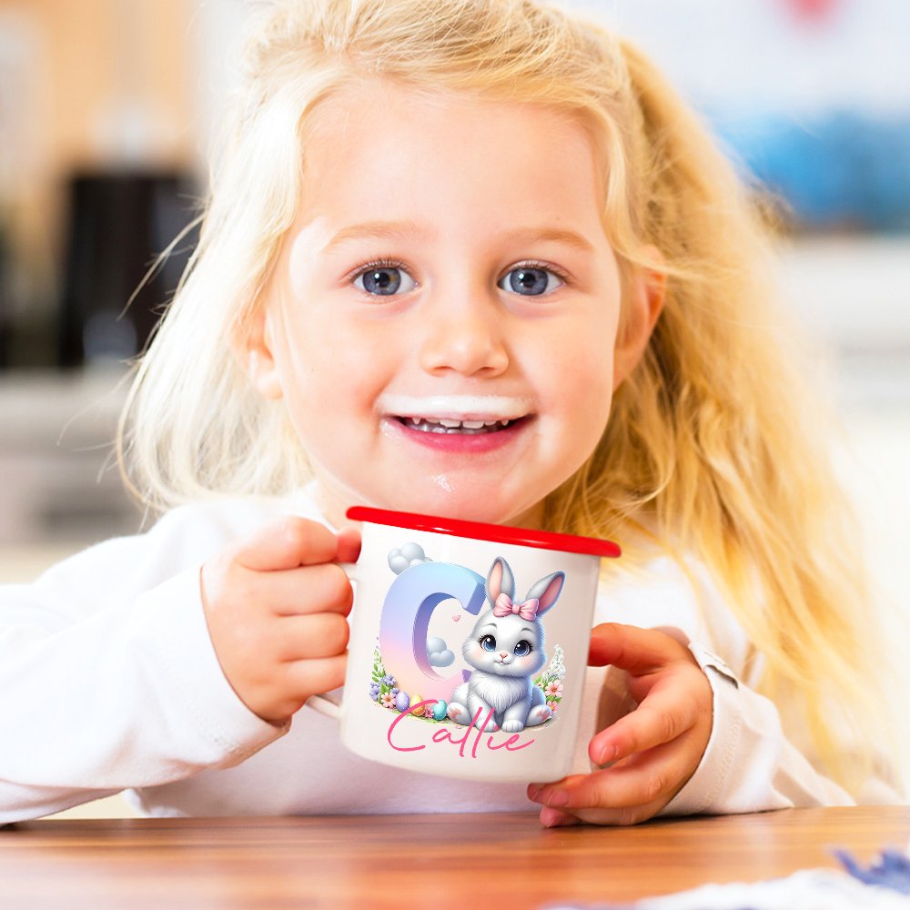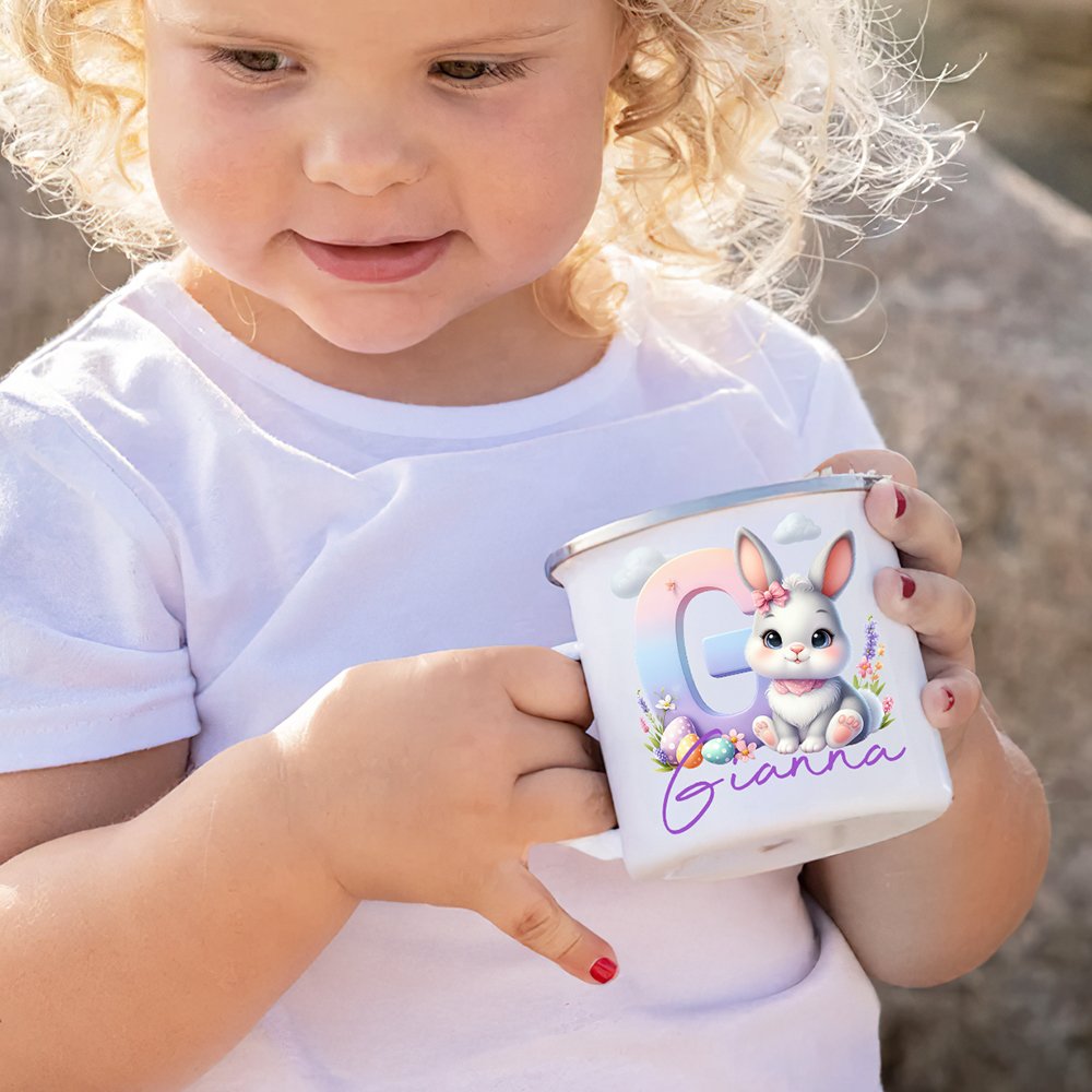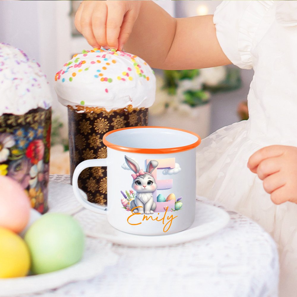 Cette adorable tasse en émail représente un adorable lapin de Pâques, ajoutant une touche amusante et festive à vos célébrations de Pâques. Personnalisez-le avec le nom et l'initiale de votre enfant pour le rendre encore plus spécial, en lui donnant un lien personnel que votre petit chéri chérira à chaque Pâques.
