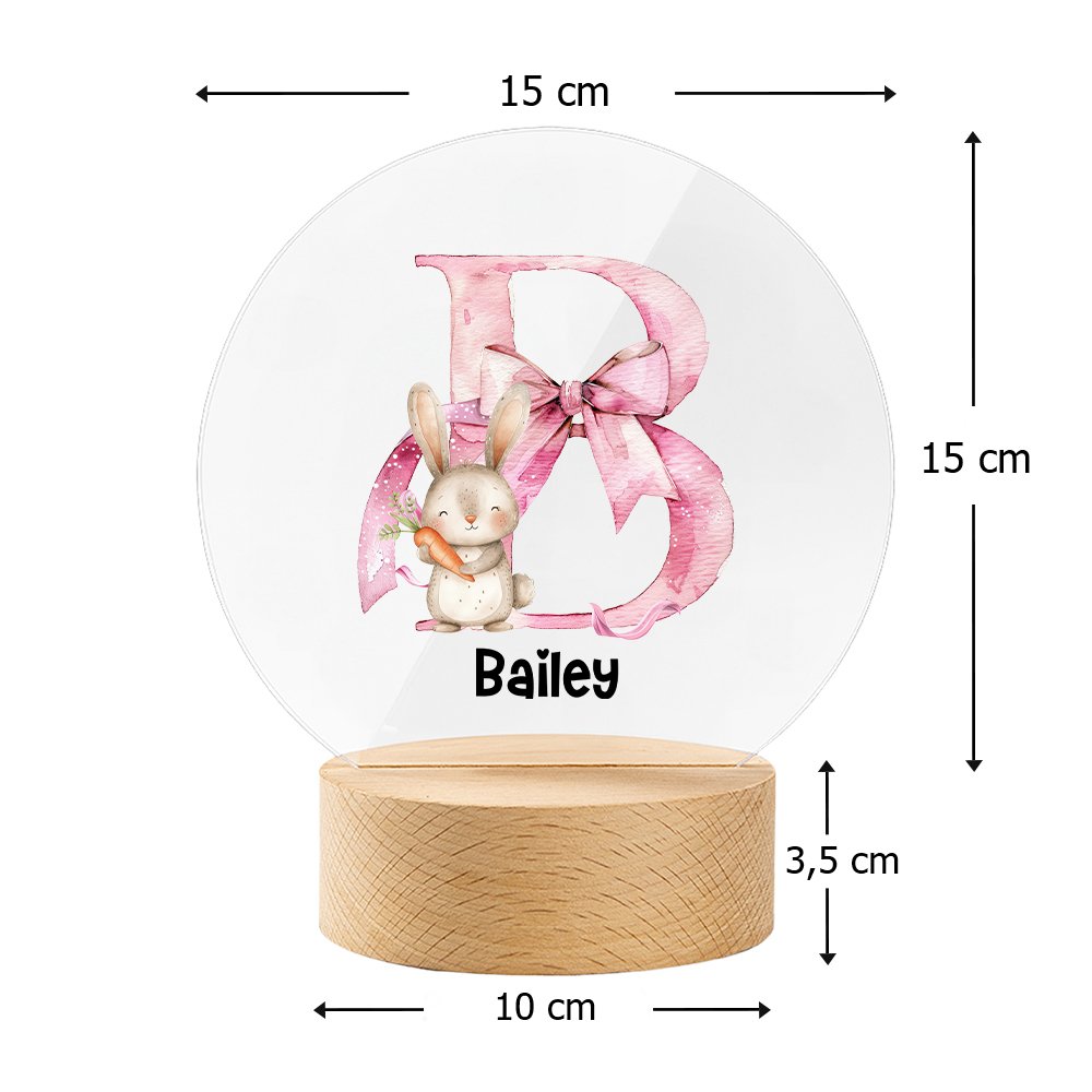 Le motif de cette veilleuse est mignon et plein d'innocence enfantine. Un nœud rose orne les initiales, et un adorable lapin de Pâques se trouve en dessous, créant une atmosphère festive. Vous pouvez ajouter des noms pour en faire un souvenir spécial pour chaque enfant, créant ainsi un compagnon de nuit pour les enfants de tous âges.
