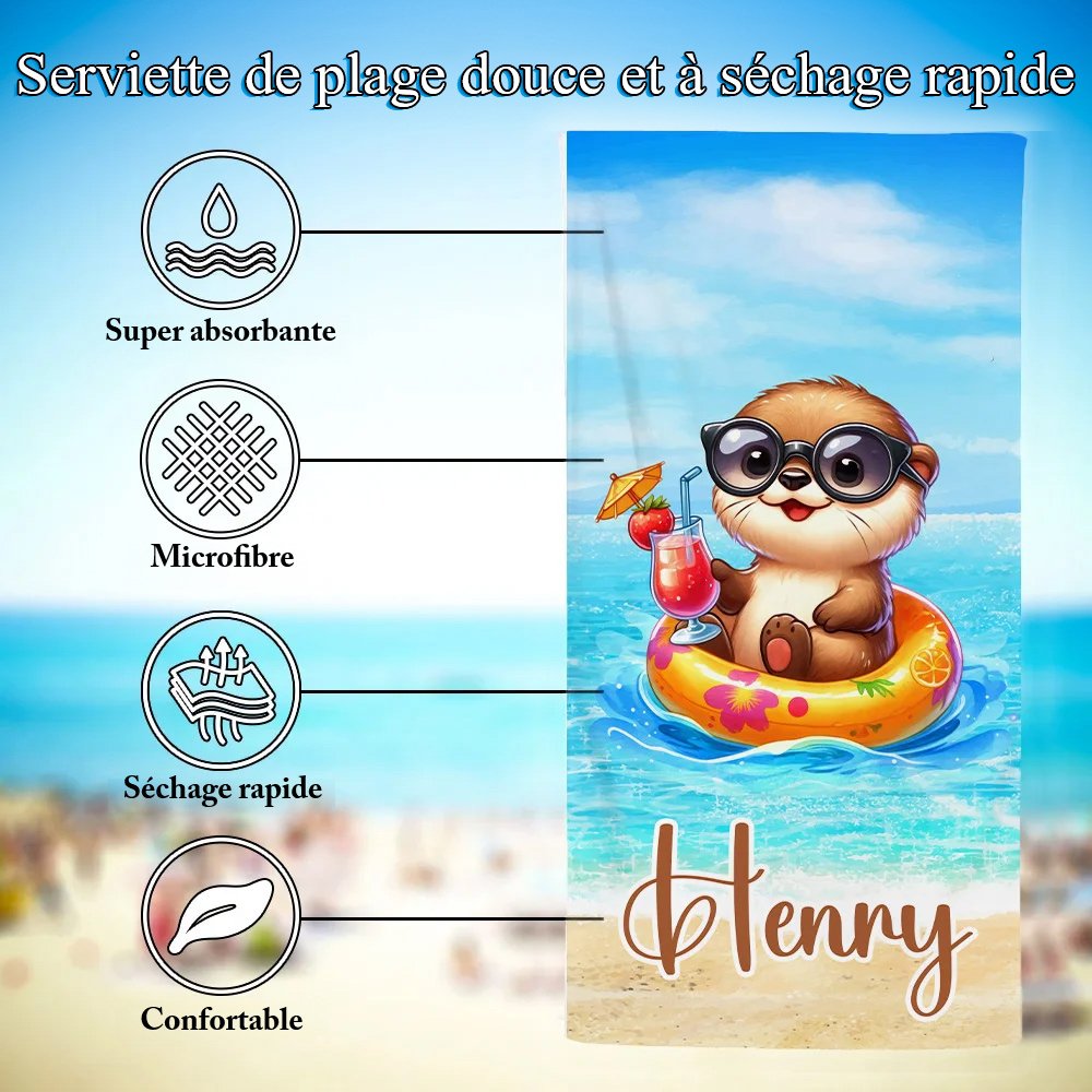 Cette serviette de plage est ornée d'un motif animalier vivant et mignon, les animaux portant des lunettes de soleil et profitant de l'été. Nous proposons 26 motifs d'animaux différents, tels que des éléphants, des girafes, des lions, des licornes fantastiques, etc. Vous pouvez choisir selon vos préférences. Vous pouvez également personnaliser le nom sur la serviette de plage, ce qui en fait un article exclusif plein de personnalité et de plaisir.