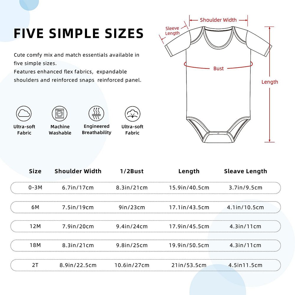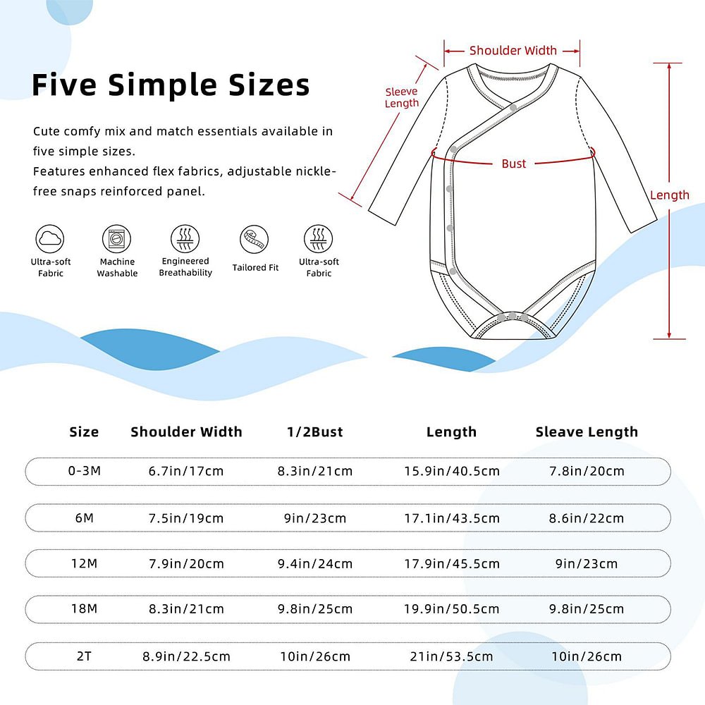 Nous proposons deux types de grenouillères à manches courtes et à manches longues. Les tailles 0-3M, 6M, 12M, 18M et 2T sont au nombre de cinq au total, afin que vous puissiez choisir les vêtements les plus adaptés à votre bébé.