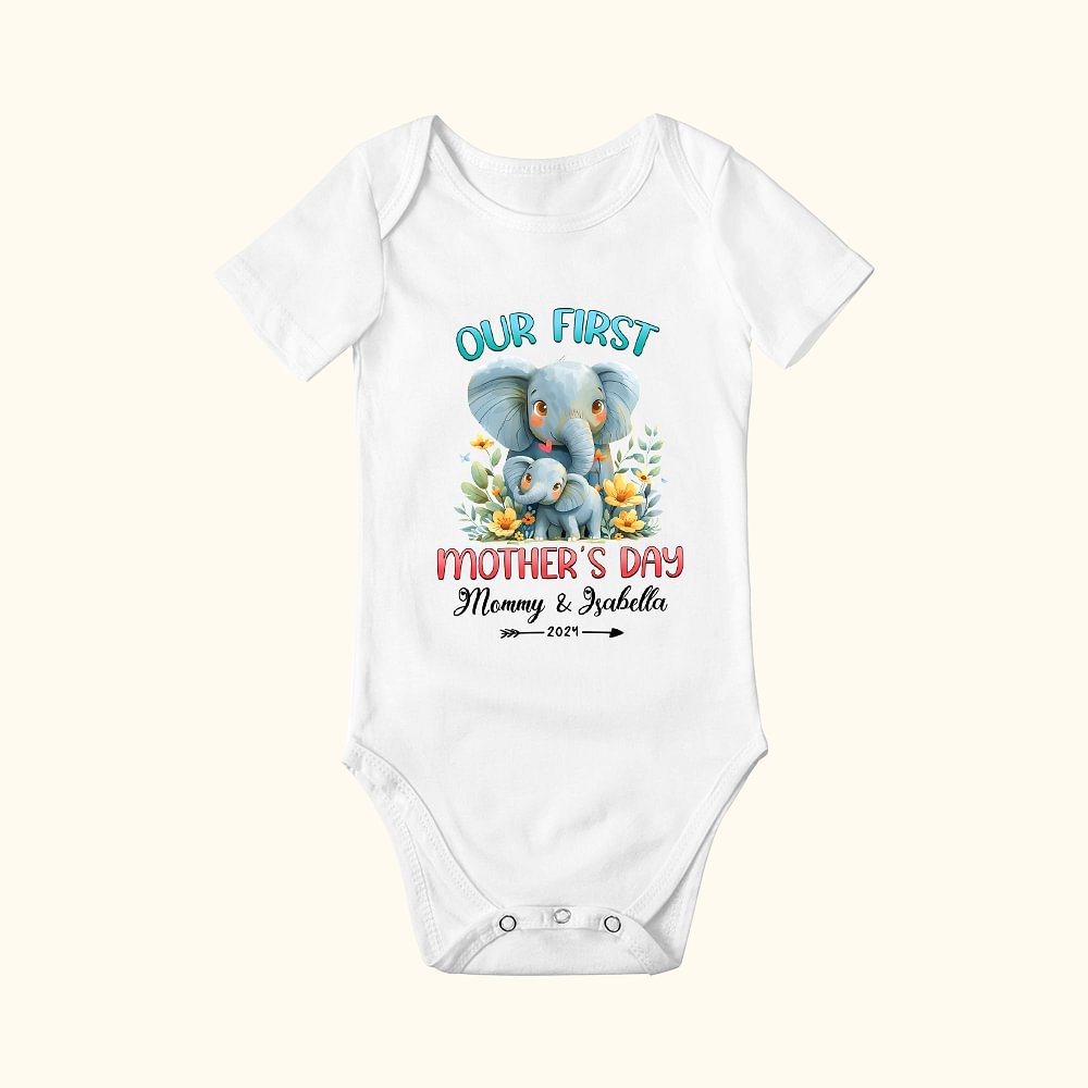 Notre modèle de grenouillère pour bébé représente un mignon éléphanteau niché avec sa mère parmi des fleurs, symbolisant la relation inséparable entre la mère et l'enfant, et montrant les moments chaleureux entre parents et enfants. Vous pouvez également personnaliser le texte pour rendre cette grenouillère unique.