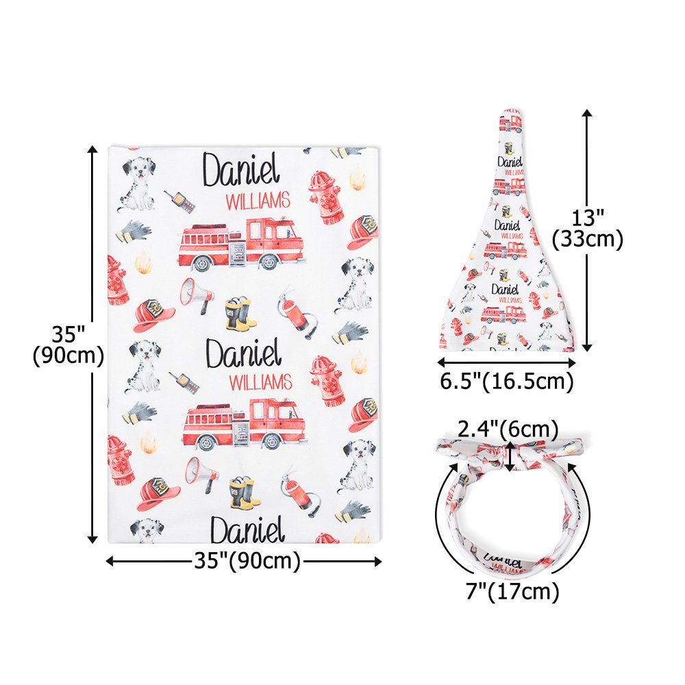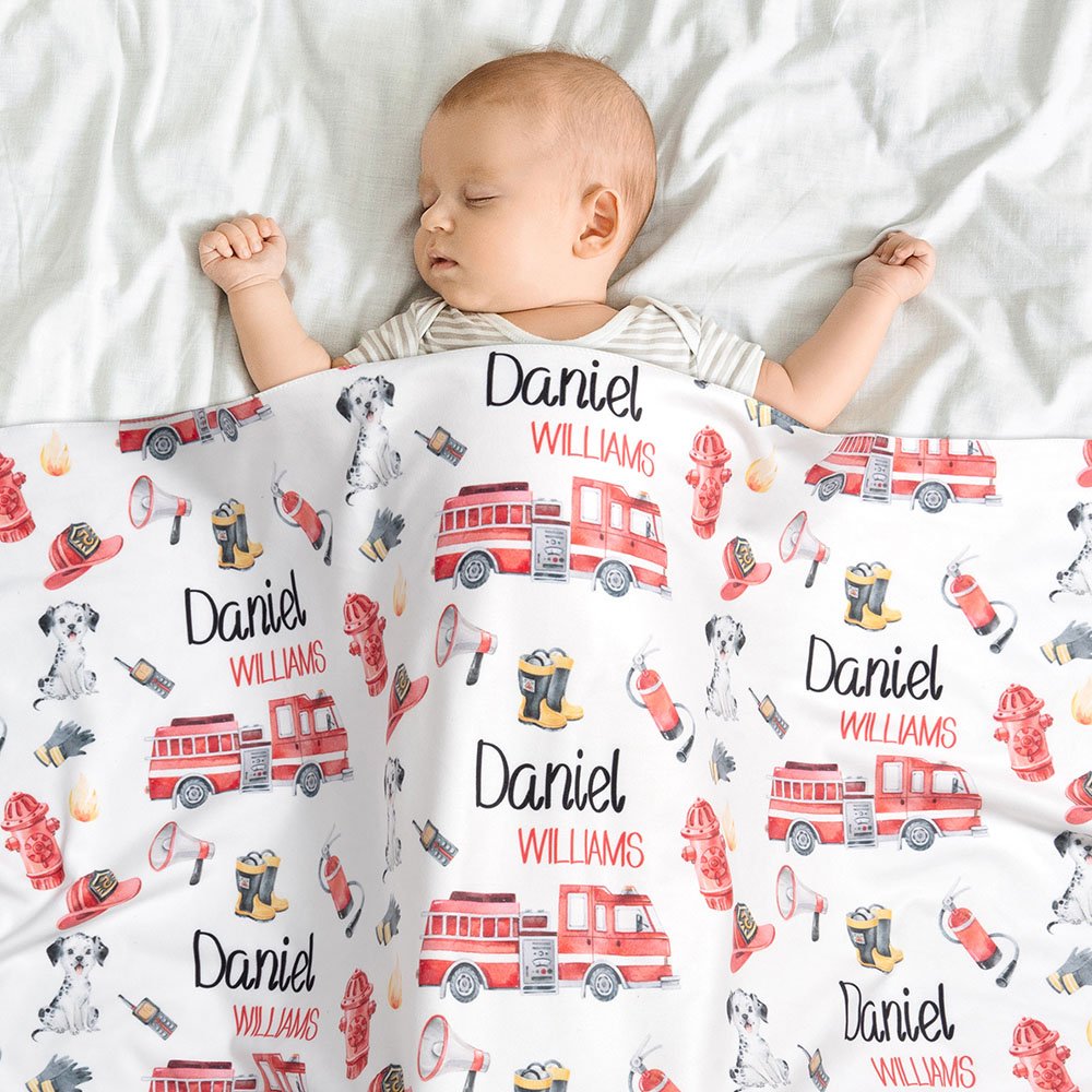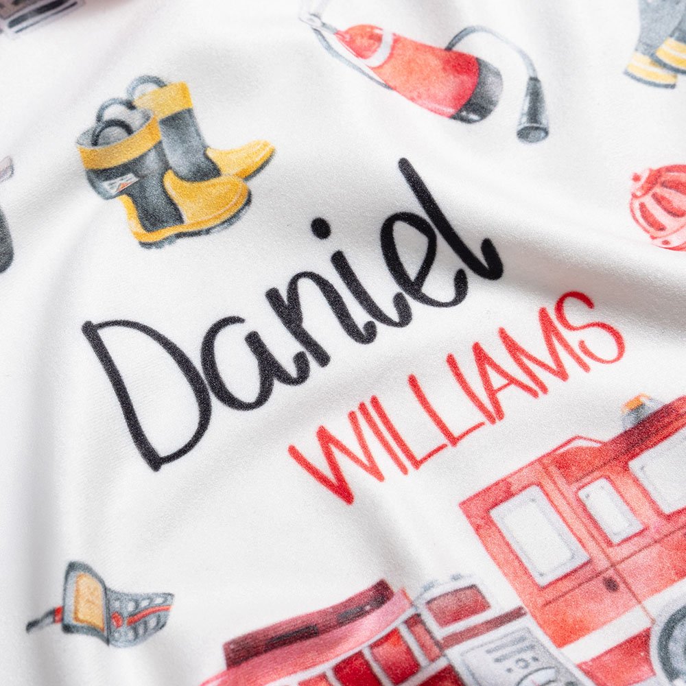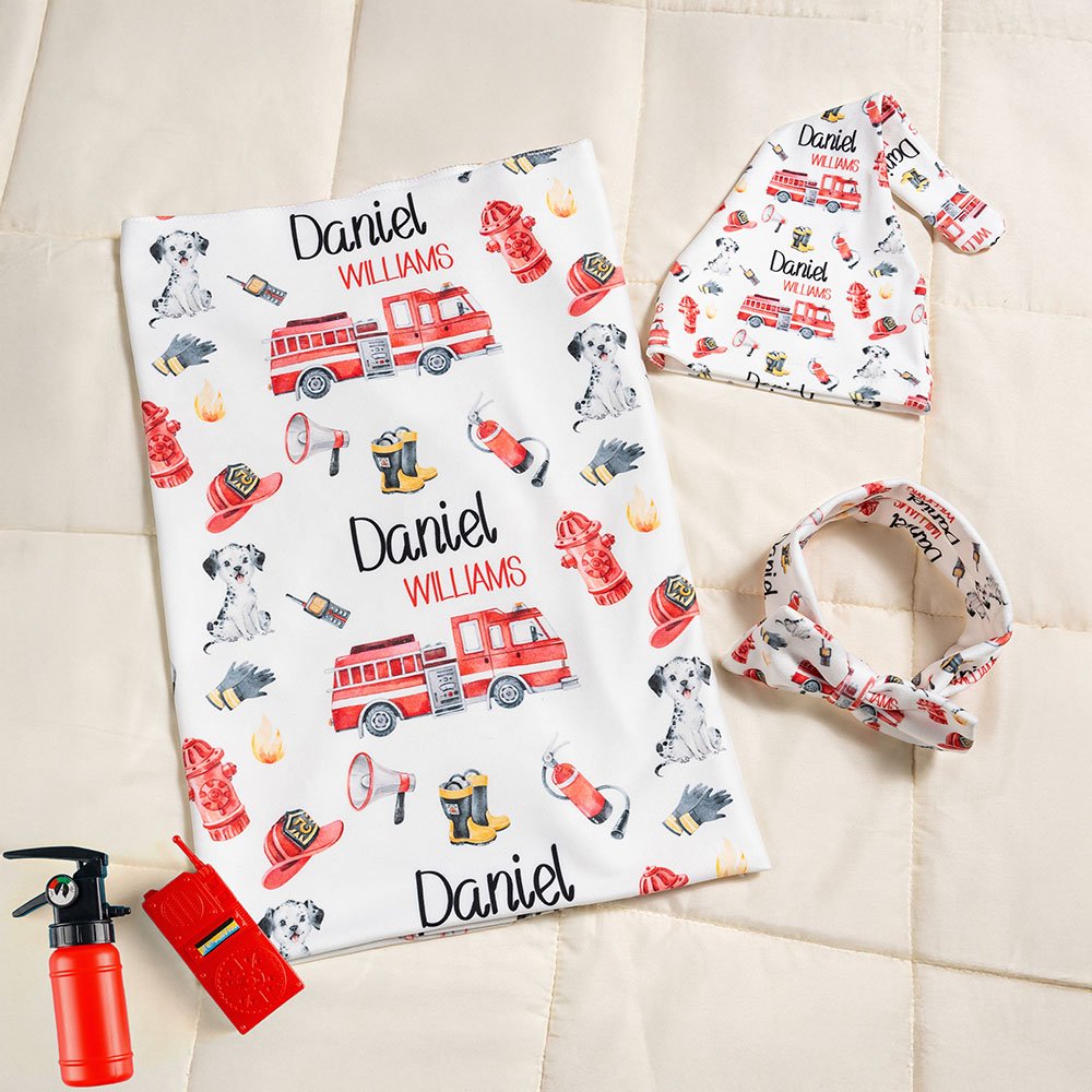 Cet emmaillotage sur le thème des pompiers représente des camions de pompiers, des extincteurs, des flammes et bien d'autres choses encore, pour un effet encore plus mignon. Vous pouvez personnaliser l'emmaillotage avec le nom de votre bébé, ce qui fera de ce cadeau un souvenir précieux.