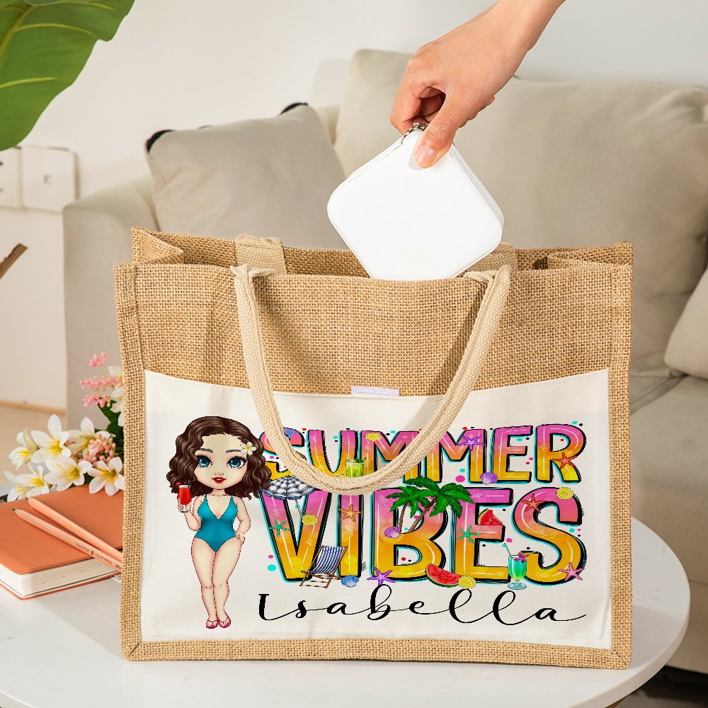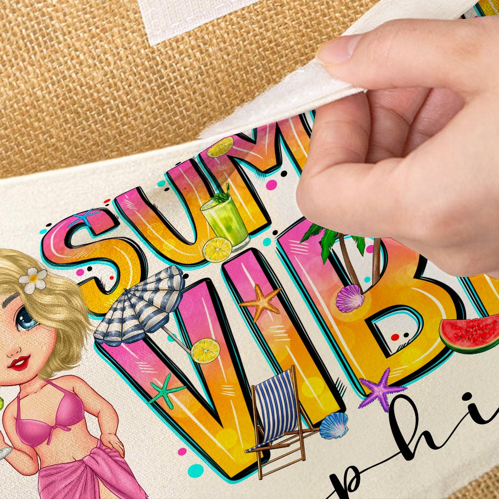 Le devant de notre sac présente un slogan "Summer Vibes", des couleurs de police dégradées et des éléments de plage tels que des jus de fruits et des cocotiers, créant ainsi une atmosphère cool et décontractée. Vous pouvez personnaliser l'image de la bande dessinée, ajouter des éléments de plage, etc.