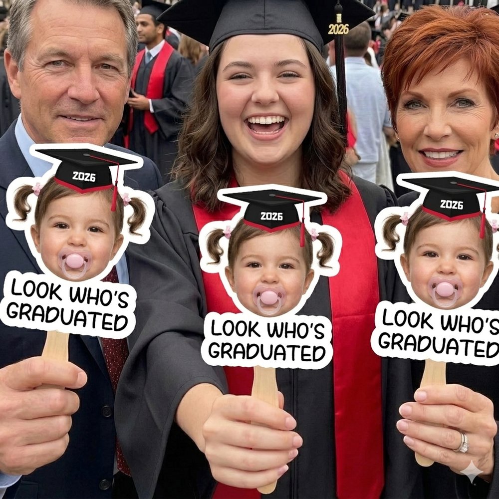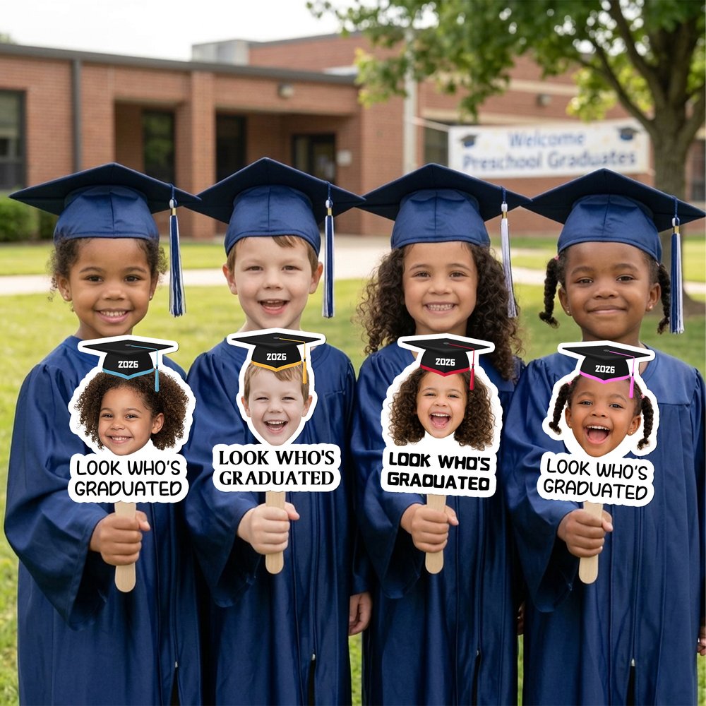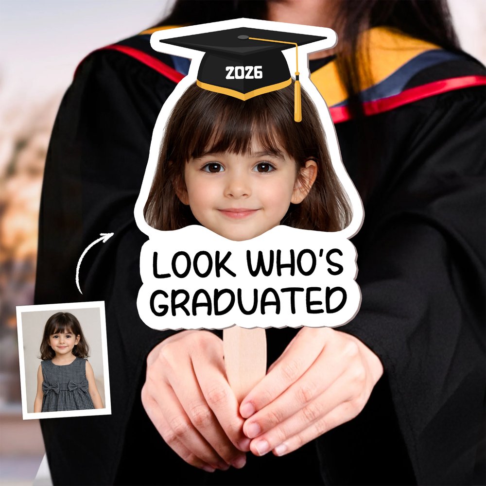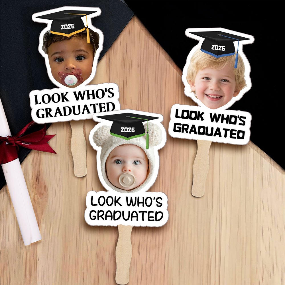 Au cœur de cet éventail de remise de diplômes se trouve une photo d'enfance personnalisée, associée à une jolie mini-casquette de remise de diplômes et à des phrases amusantes telles que "LOOK WHO'S GRADUATED" (regardez qui a obtenu son diplôme), afin de faire le lien entre les premières années de l'enfant et ce moment important. Vous pouvez librement télécharger la photo d'enfance du destinataire, sélectionner une année et des couleurs personnalisées, transformant ainsi chaque éventail en un souvenir unique.