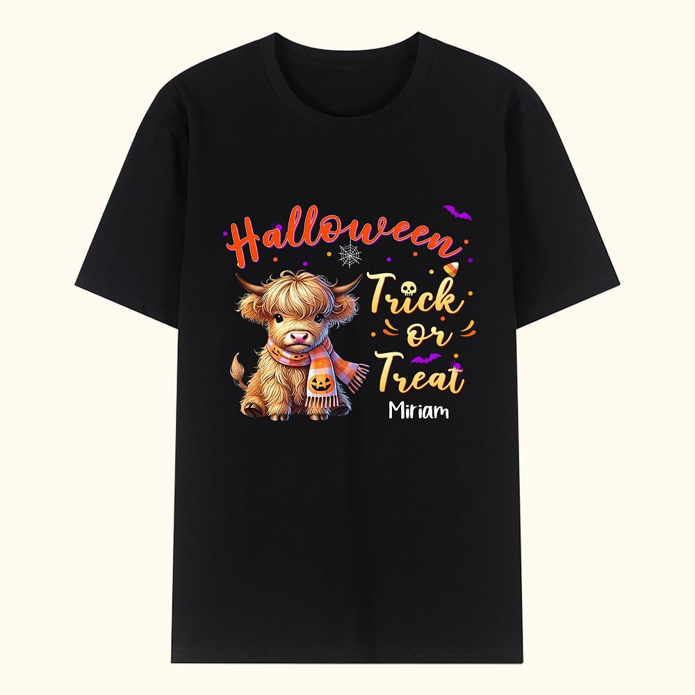 Ce T-shirt sur le thème d'Halloween, pour adultes ou enfants, est plein d'humour et de personnalité. Vous pouvez choisir parmi 24 styles différents de graphismes de vaches Highland, et le nom peut être personnalisé en fonction de vos besoins, ce qui fait de ce T-shirt un vêtement de fête vraiment exclusif.