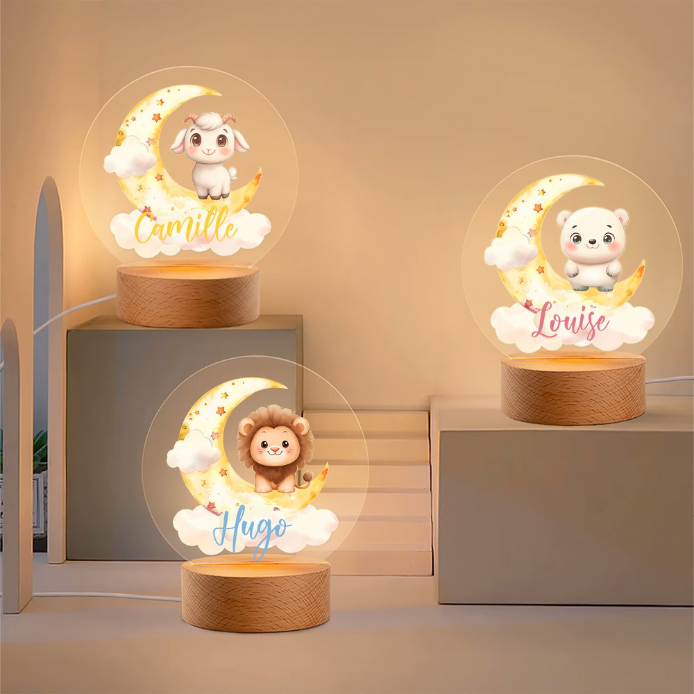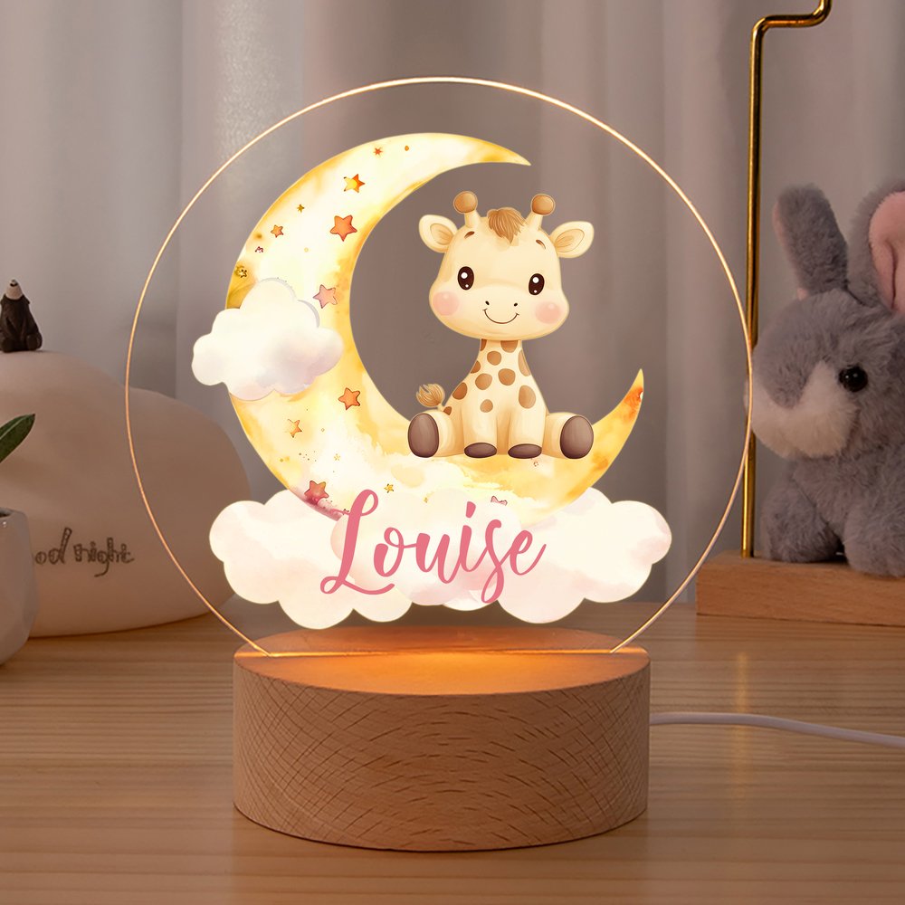 Cette veilleuse présente les thèmes enchanteurs de la jungle et de la vie marine, complétés par des éléments oniriques tels que la lune et les nuages, pour une expérience visuelle digne d'un conte de fées. Avec un nom personnalisable, chaque enfant peut avoir un compagnon de nuit personnalisé. Qu'il s'agisse d'un lion plein de vie ou d'une girafe câline, il s'agit d'un élément décoratif distinctif qui ajoute du charme à n'importe quelle chambre.